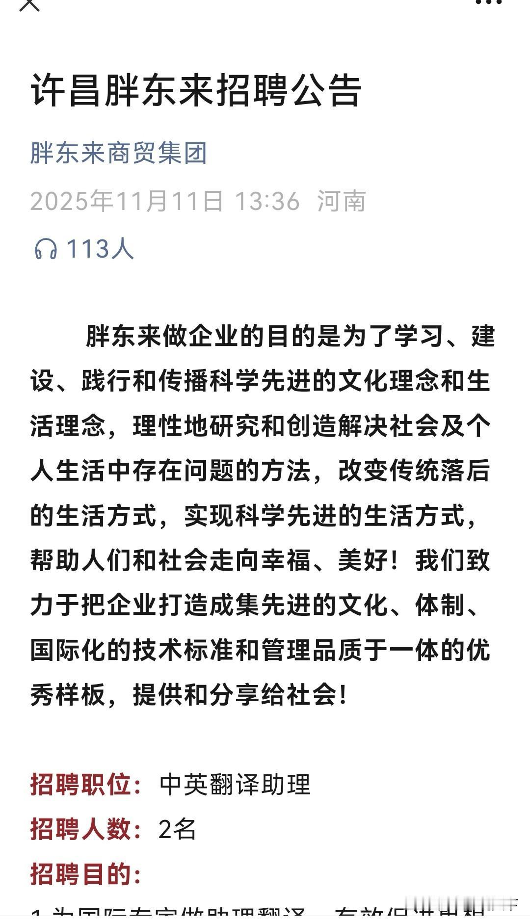 今天许昌胖东来又开始招聘了, 有两把刷子的赶快报名了! 年薪不低于50W!