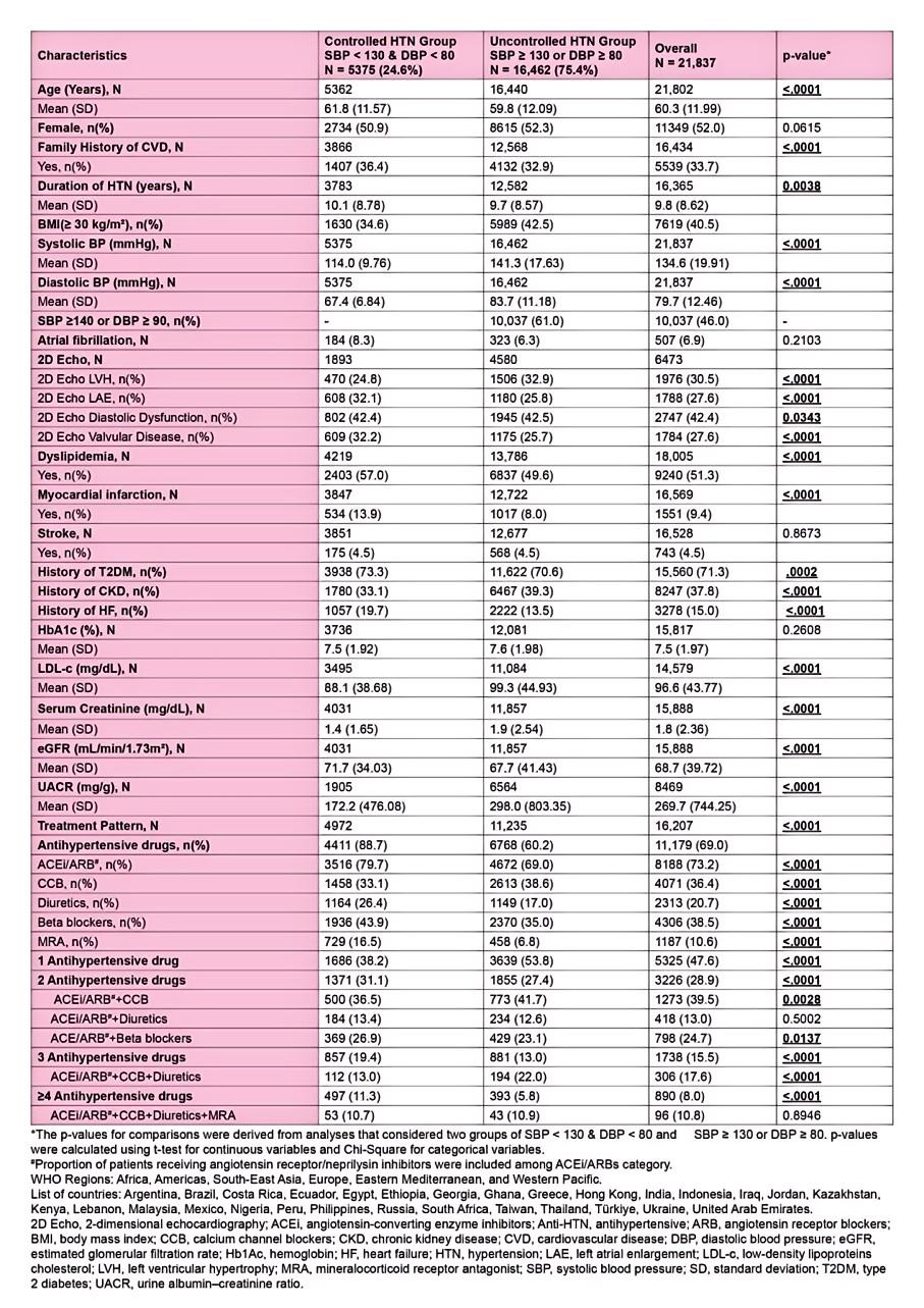 研究结果显示,高血压患者共病负担重,其中71.3%合并T2DM,51.3%合并血脂异常,37.8%患有CKD,15.0%合并HF。同时,血压控制现状堪忧,75.4%的患者血压未达标(BP≥130/80mmHg),其中61%患者血压≥140/90mmHg。与血压控制组相比,未控制组患者更年轻(59.8岁vs.61.8岁)、肥胖率更高(42.5%vs.34.6%),合并CKD的比例更高(39.3%vs33.1%)。此外,在未控制高血压患者中,60.2%的患者接受降压治疗,其中超过1/2患者仍接受单药治疗,接受≥2种降压药物治疗的患者仅占46.2%(表1)。这项真实世界研究为全球高血压管理敲响了警钟。尽管有充分的证据支持严格血压控制的益处,但现实中的治疗依从性和血压控制率仍然很低,迫切需要改进治疗策略,以更好地控制血压和预防并发症。