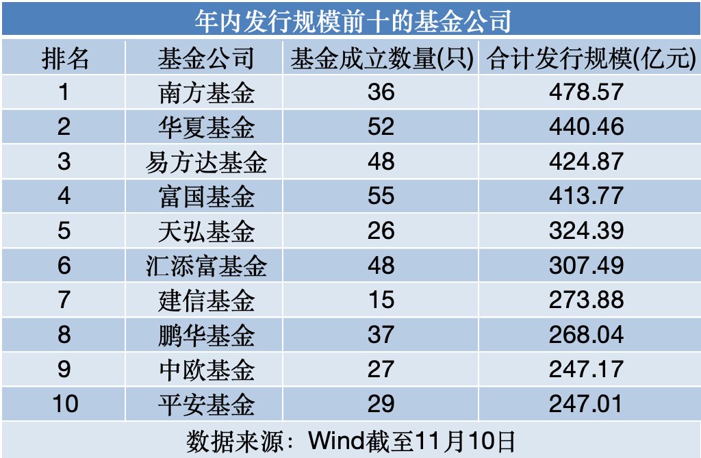 南方基金销量最高,发行规模合计478.57亿元;华夏基金以440.46亿元排在第二,易方达和富国的发行规模也在400亿元以上。