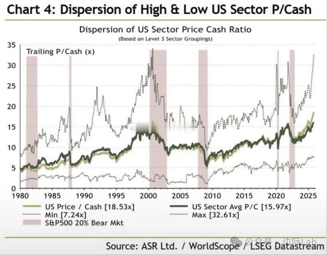美股不同板块间市现率(P/Cash)估值的离散度已扩大至历史极端水平,最高与最低倍数之间的差距已接近2000年科网泡沫时期的峰值。历史上这种估值分化的极端高点,往往发生在市场重大逆转到来之前。来源:ASR