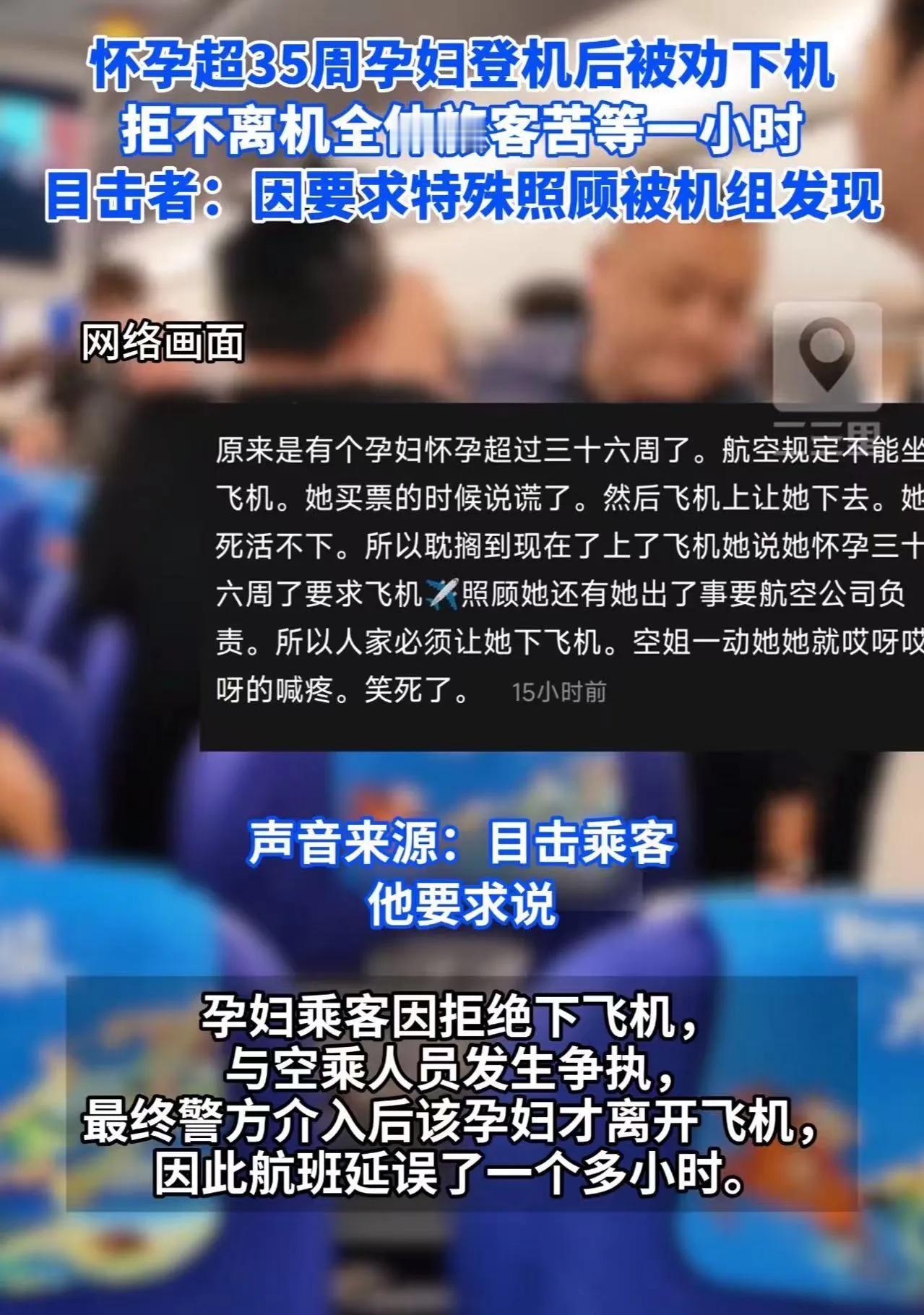 胆大包天!孕妇藏孕情登机耍无赖,全机人陪等1小时! 见过自私的,没见过这么自私的!一孕妇隐瞒35周孕情登机,要特殊照顾被拒后赖着不走,直接让西藏航空航班延误1小时,最后只能叫警察来收场。 西藏航空早有规定,孕满35周不给坐飞机,购票时还特意提醒,这可是保障安全的“硬规矩”。可这女子偏要钻空子,藏着孕情上了机,转头就找机组要特殊照顾,简直是“得了便宜还卖乖”。 机组一听吓一跳,高空飞行中孕妇要是突然早产,机组根本没法应对,这风险堪比“在刀尖上跳舞”。好说歹说劝她下机,她倒好,反过来道德绑架,说机组“不人道”,死活不肯挪窝,满机人的时间全被她耽误了,跟“打水漂”似的。 从法律上讲,她这行为已经违反《治安管理处罚法》,涉嫌扰乱公共秩序。规则不是给别人定的,孕妇享权利也得尽义务,别把自私当理所当然。 公共秩序得靠大家守,你觉得这孕妇该受处罚吗?来评论区聊聊!