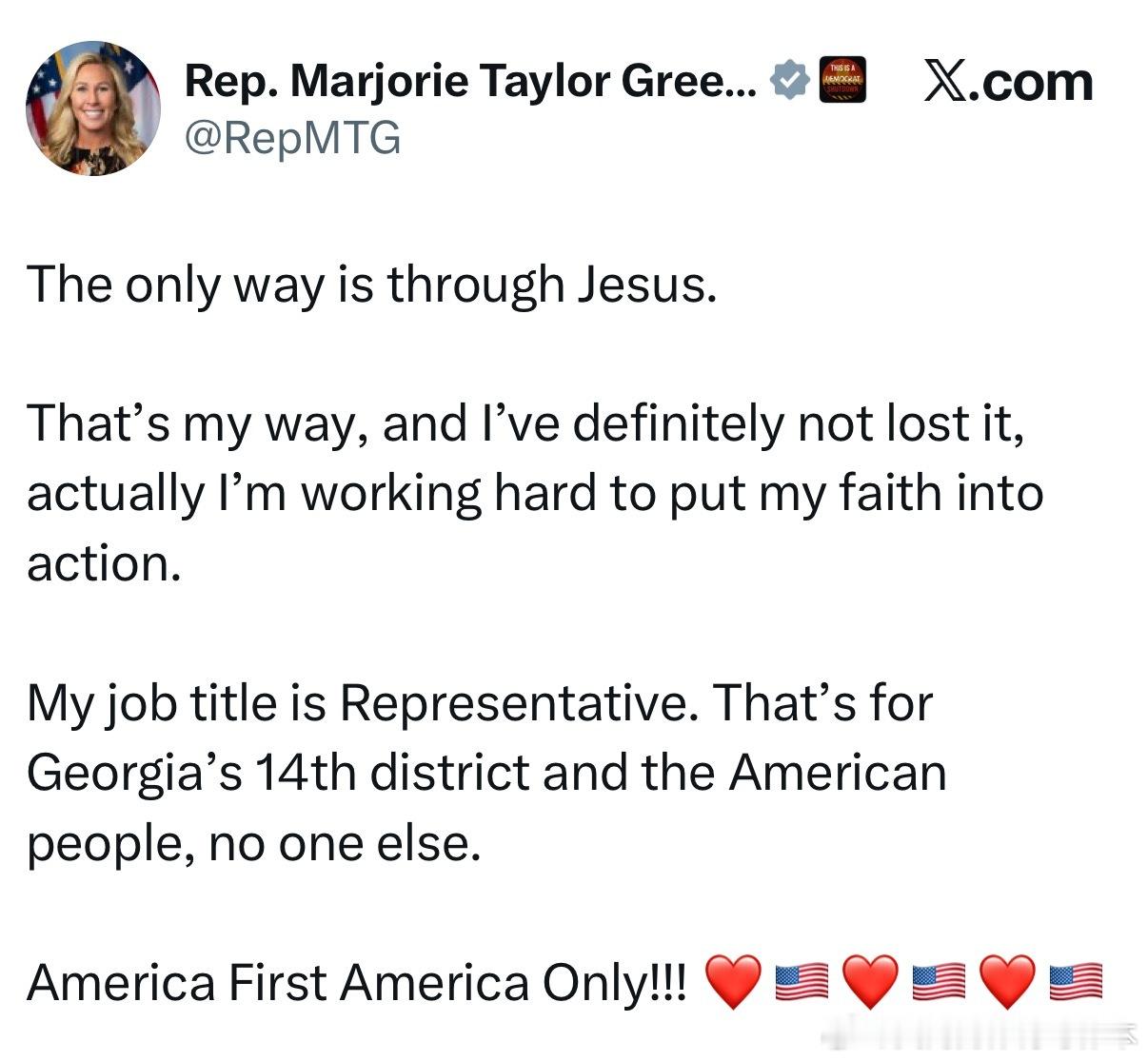 【黄金时代】面对川普说,马娇蕊迎合激进左翼,马娇蕊隐性与川普切割,说她不代表任何人:唯有通过耶稣才能走上正路。这就是我的道路,而且我绝对没有迷失方向,事实上,我正在努力将我的信仰付诸行动。我的头衔是众议员。我代表佐治亚州第14选区和美国人民,不代表其他任何人。美国优先,美国至上!!!