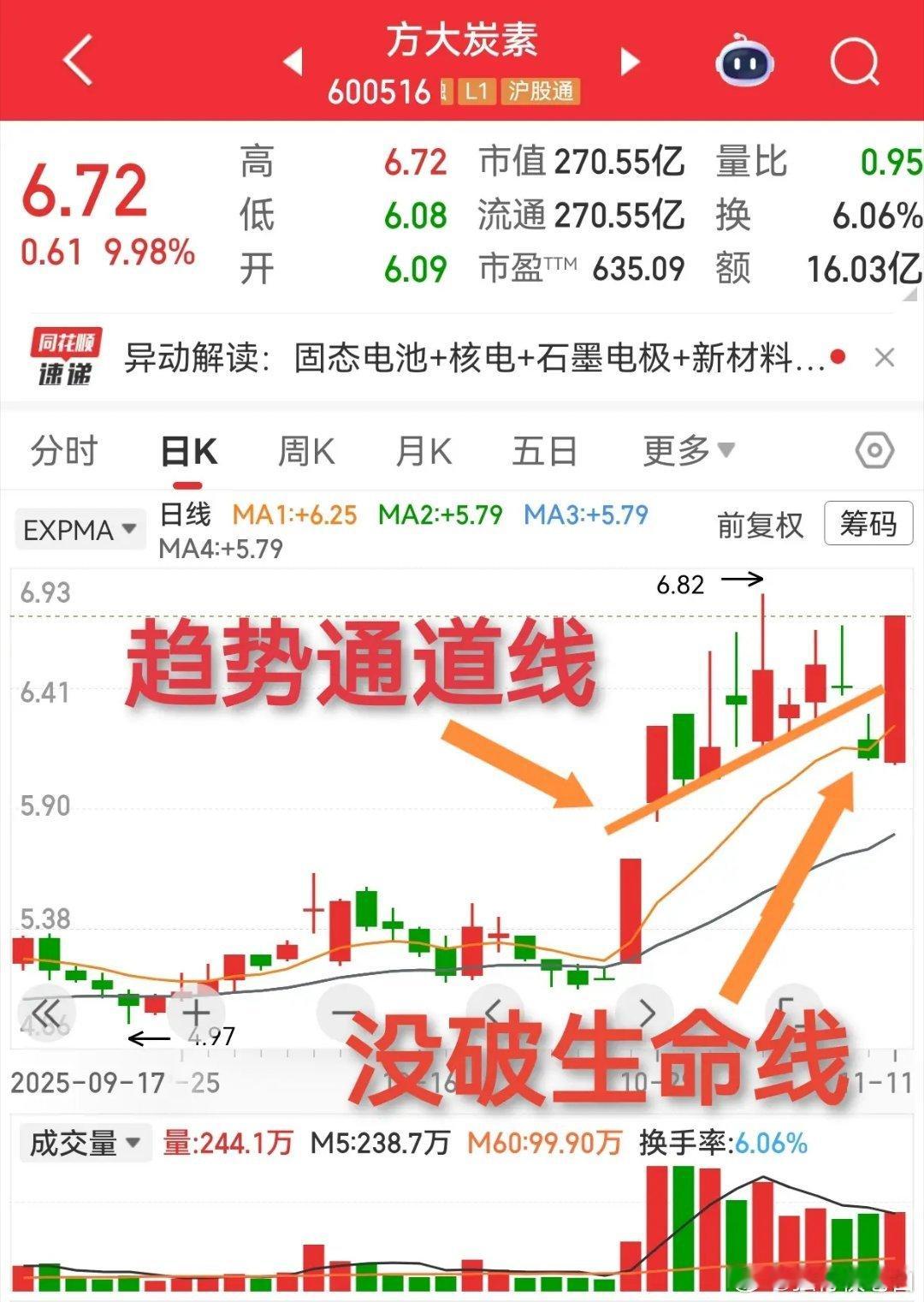 由方大炭素icon的涨停,看破位走势的真假。今天看到方大炭素涨停,让我想到了一个事情,最近主力手法变化较快也较多,曾经的笑脸形态,低开长阳形态,上升三角形形态,成功率在降低,主力不断搞出新玩法。目的是玩傻散户,坑蒙拐骗,无所不用其极。方大炭素两连板后,八天时间都在沿着趋势通道走,底部逐渐抬高,一般认为末端会选择突破,但主力不想带着你好好玩,第九天玩了一个跌破趋势通道的跳空缺口,就问你怕不怕,正常情况下,技术派都会跑路,因为在技术派看来,这种属于破位下跌,往往是突发利空引起的,后面会继续下跌,如果不卖损失难以把控。主力就是利用散户看盘心理,画出此种形态,逼散户投票。但是细心观察的话,会看到,这一跌,虽然跌破趋势通道但并没有跌破生命线。真假由此可见。如果真破位出逃,就会不管生命线还是趋势线,啥线都不管不顾,一路下去。假破位,就会在生命线附近止住跌势。刚才看到有人在上一篇文里留言说,方大昨天为什么跌都不知道,就来写就是乱写,水平也就这样。我笑了,你以为你很了解原因,殊不知你所看见的知道的原因只是主力想让你看到的东西,如果不想让你先看到,你以为能先知吗,不要太天真了。特别提醒:贴图欣赏,并非推荐,据此操作,风险自担。✦✦✦本人仅此一号不主动加人,主动加人者是骗子。请提高警惕,否则损失自负。✦✦✦