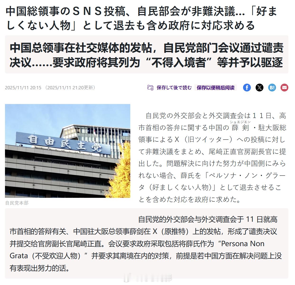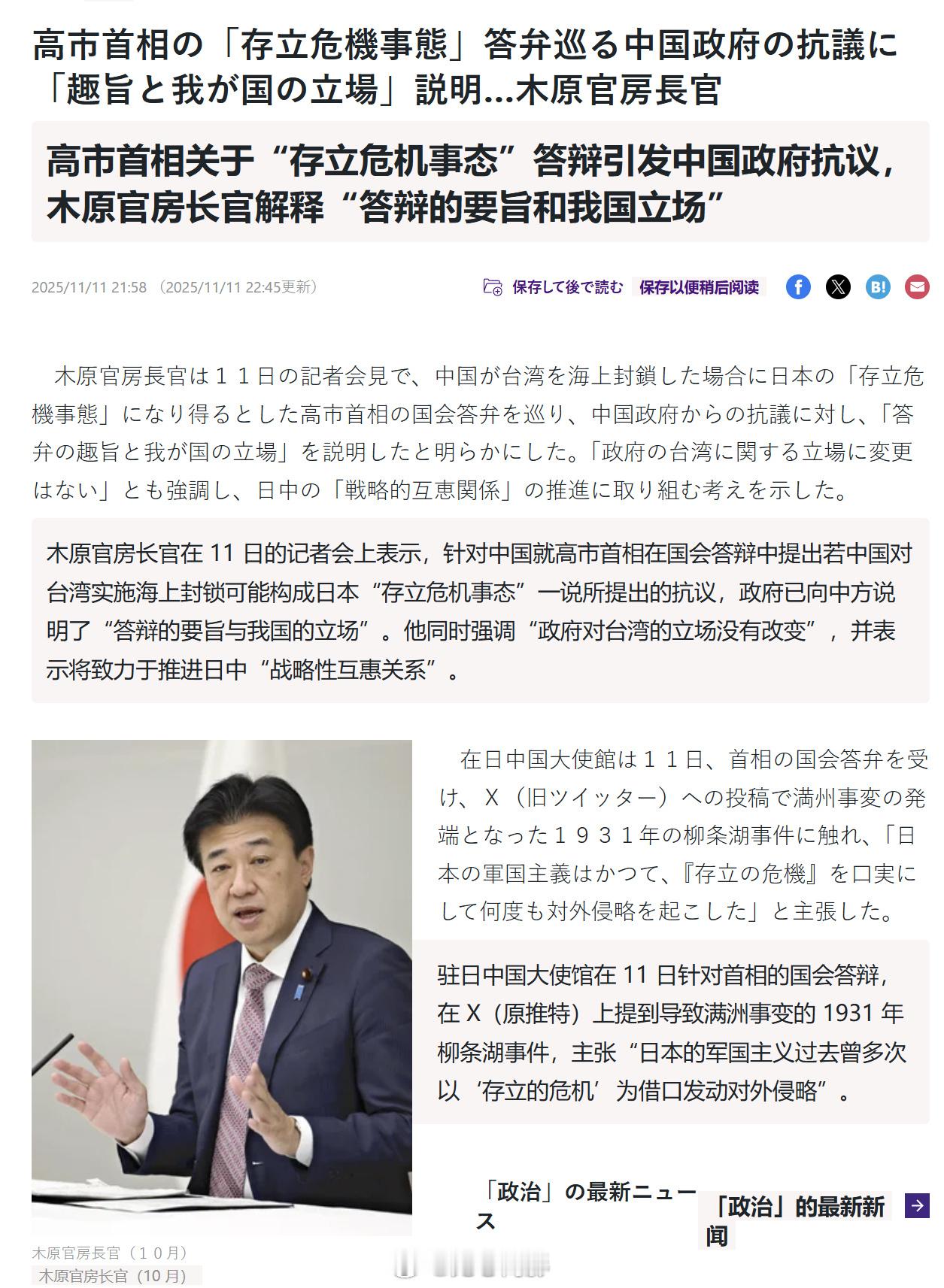 日本自民党这边,还在研究要求日本政府把薛剑领事“驱逐出境”的对策。报道称,自民党的外交部会和外交调查会于11日汇总了针对中国驻大阪总领事薛剑就高市早苗的答辩在X(原推特)上发文的谴责决议,并提交给了官房副长官尾崎正直。该决议要求政府,若中国方面没有为解决问题付出努力,应采取包括将薛剑列为“不受欢迎的人”并驱逐其出境在内的应对措施。在野党也纷纷(对中方)提出批评,立宪民主党的安住干事长表示“这对中日关系没有任何好处”。与此同时,日本官房长官11日才回复了中方的抗议(图2),记者会上除了声明“中日两国友好”之类的内容外,并没有提起任何要求中方就薛领事的帖子作出任何处理的事情。那怎么办,特朗普表态不想理这事儿,日本政府也怂了,日本政党却不干,明天在新的答辩会上来个多党逼宫?