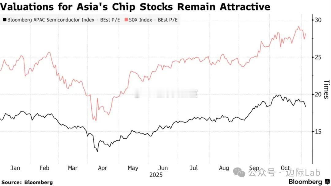 尽管经历了回调,亚洲半导体板块仍维持着相对美国市场的显著估值折价。数据显示,彭博亚太半导体指数的远期市盈率约为18倍,远低于费城半导体指数28倍的水平。这一估值差异是此前吸引资金流入并推动亚洲科技股跑赢美股的关键因素。然而,近期的抛售表明,单纯的估值吸引力并未能完全抵御市场对增长见顶的担忧与获利了结的压力,部分机构投资者已开始减持仓位。来源:Bloomberg
