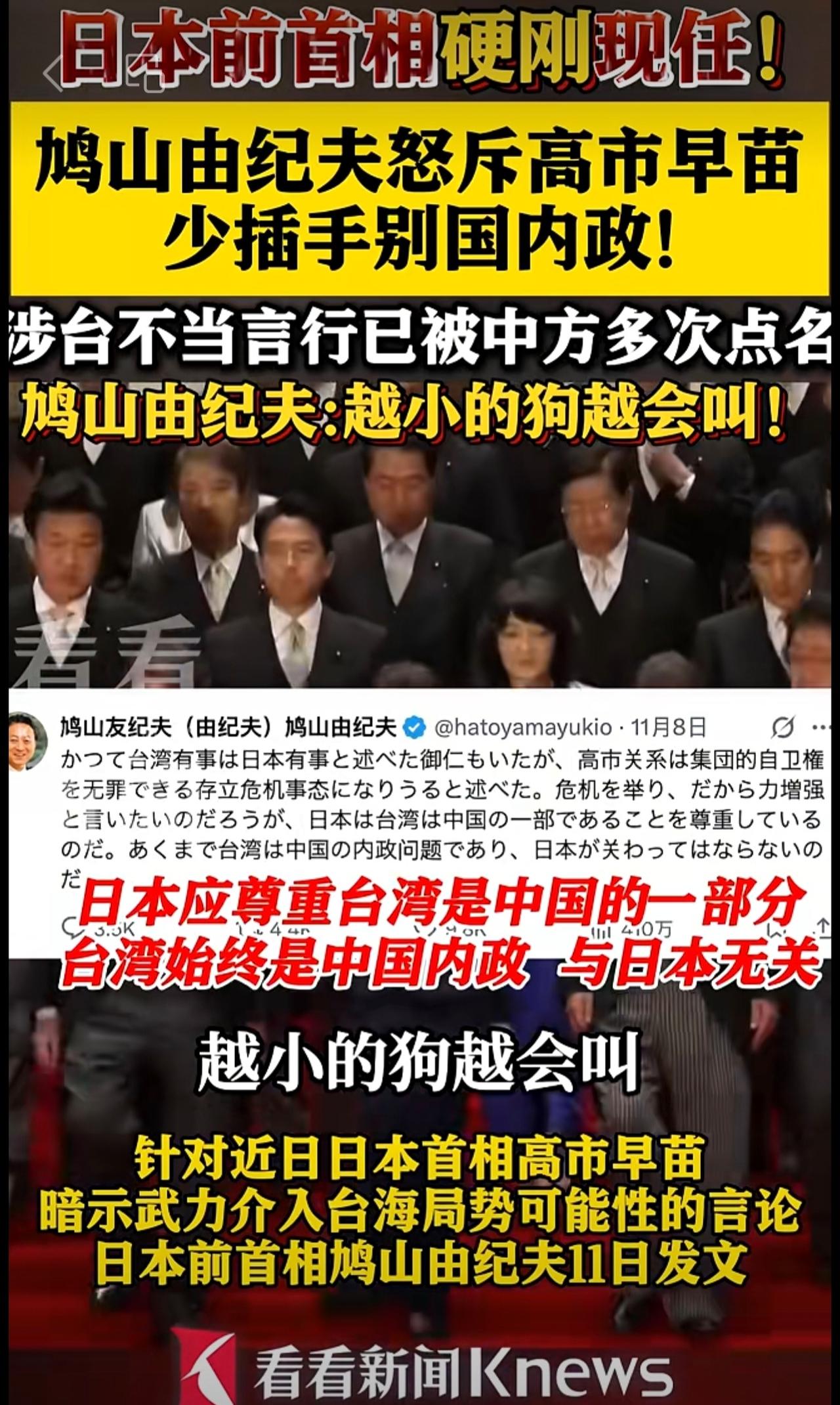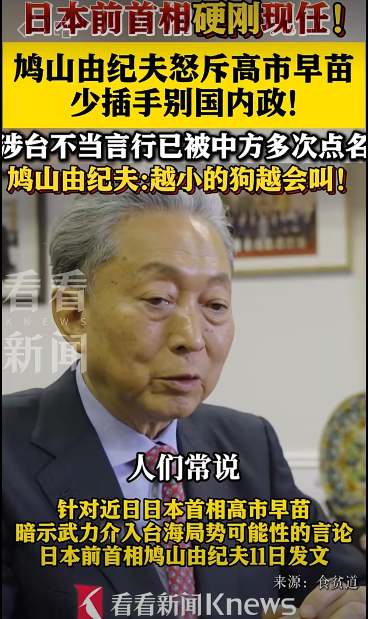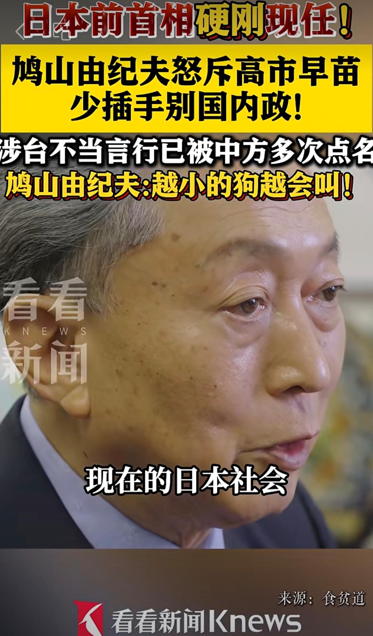 日本前首相硬刚现任!鸠山由纪夫怒斥高市早苗 :少插手别国内政!高市早苗涉台言论已被中方多次点名日本台湾 点击关注@看看新闻Knews