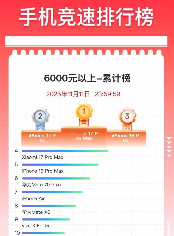双11结束,高端旗舰还是iPhone的天下,霸占前三,小米17 Pro Max是6000+价位段唯一杀出重围,闯进前五的国产旗舰,位列第四。