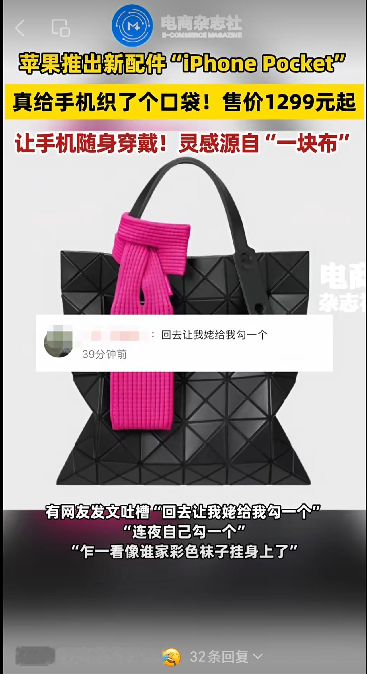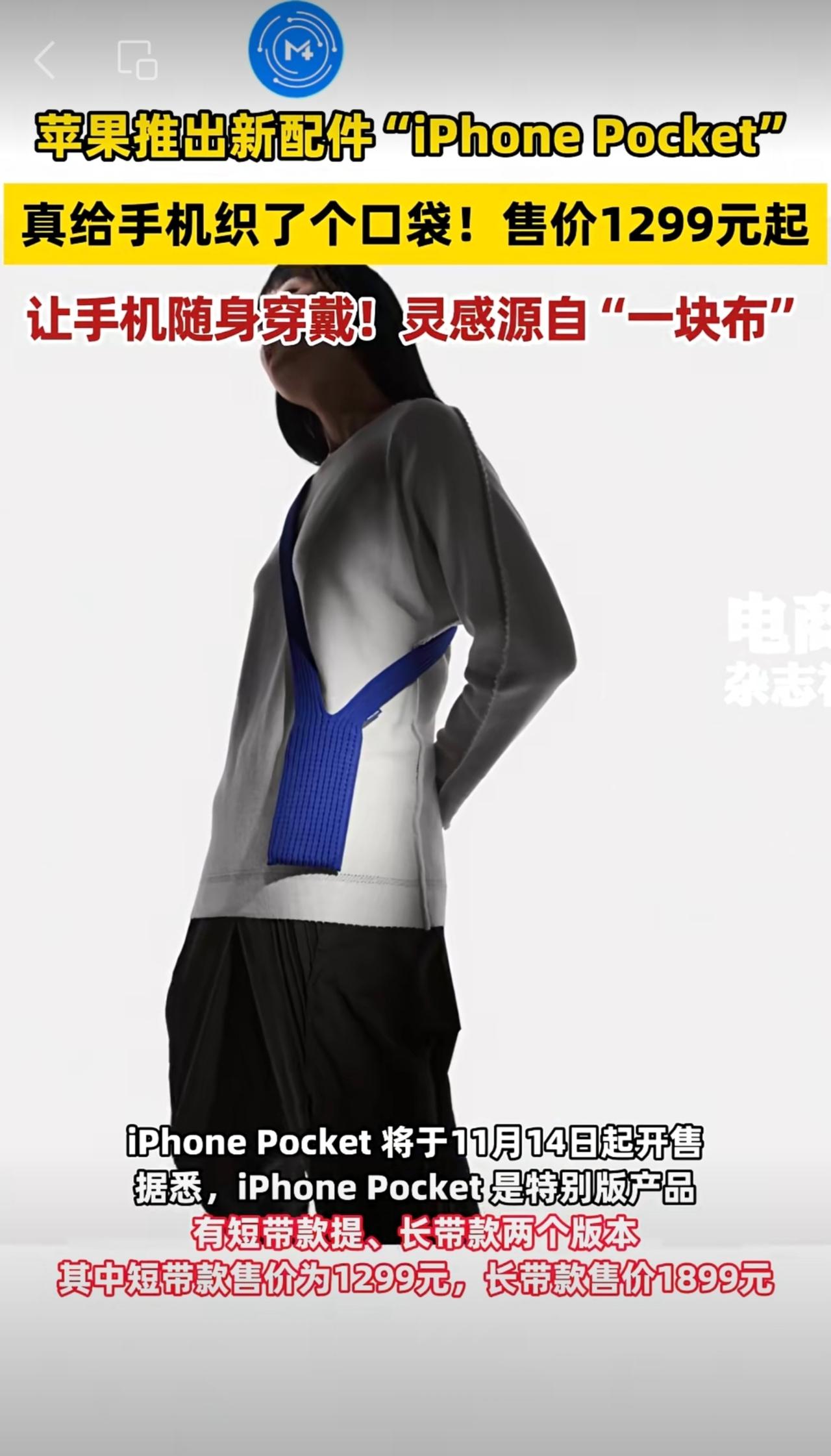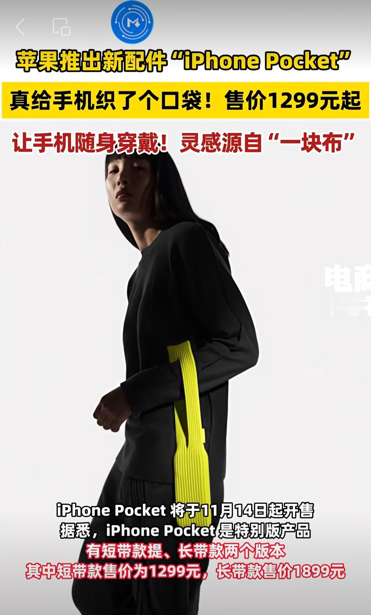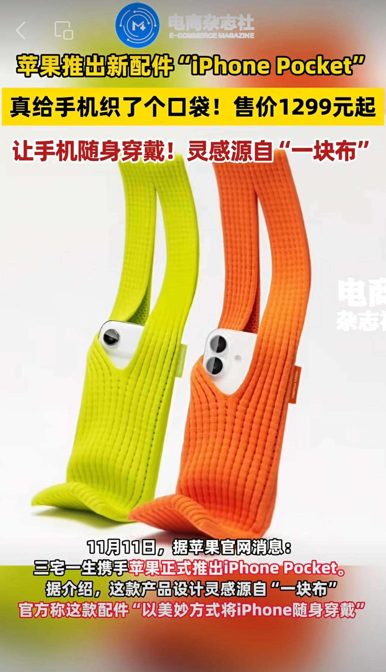 苹果推出新配件“iPhone Pocket”,售价1299元起!真的给手机织了个口袋,官方称能让手机随身穿戴!