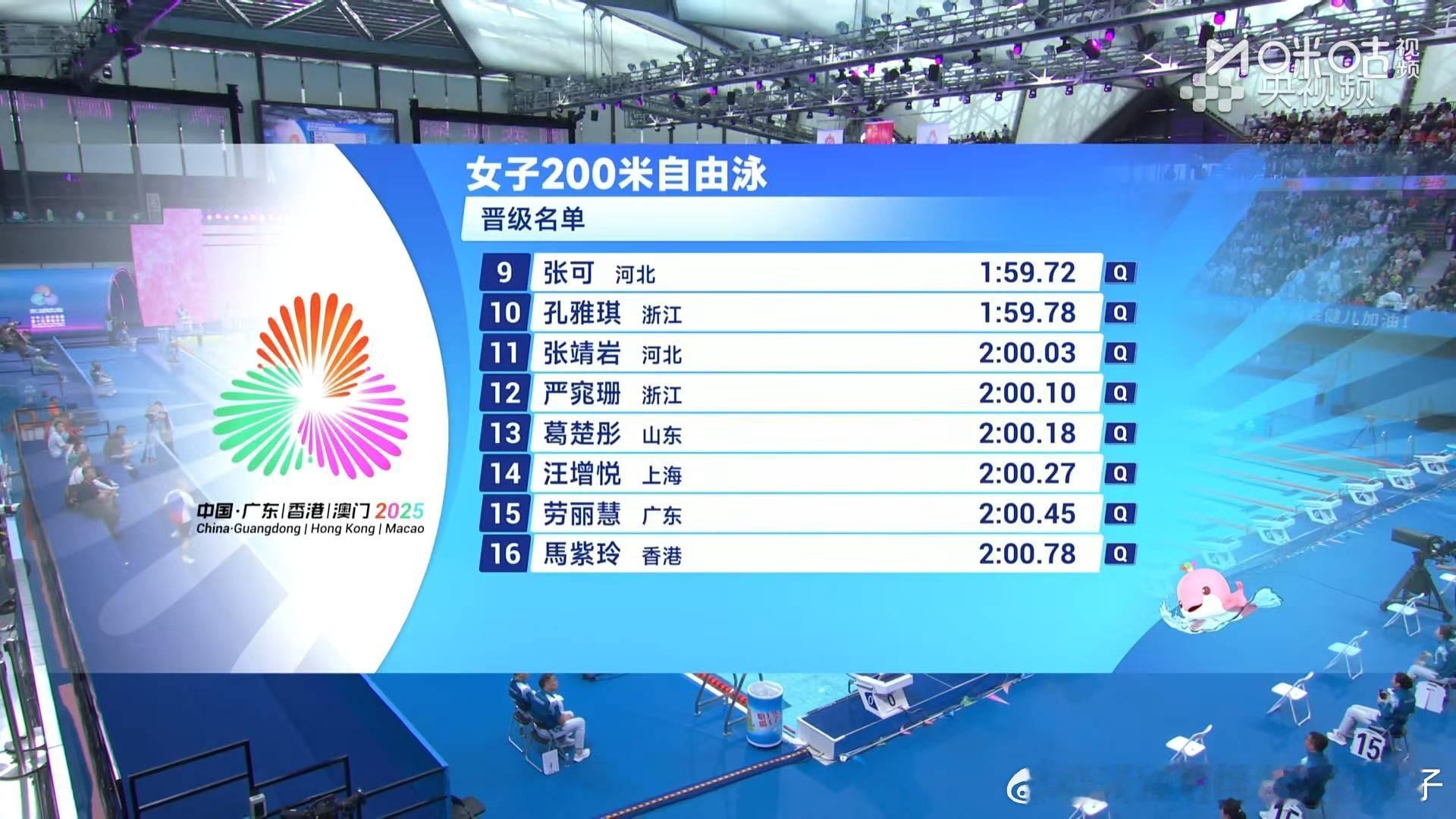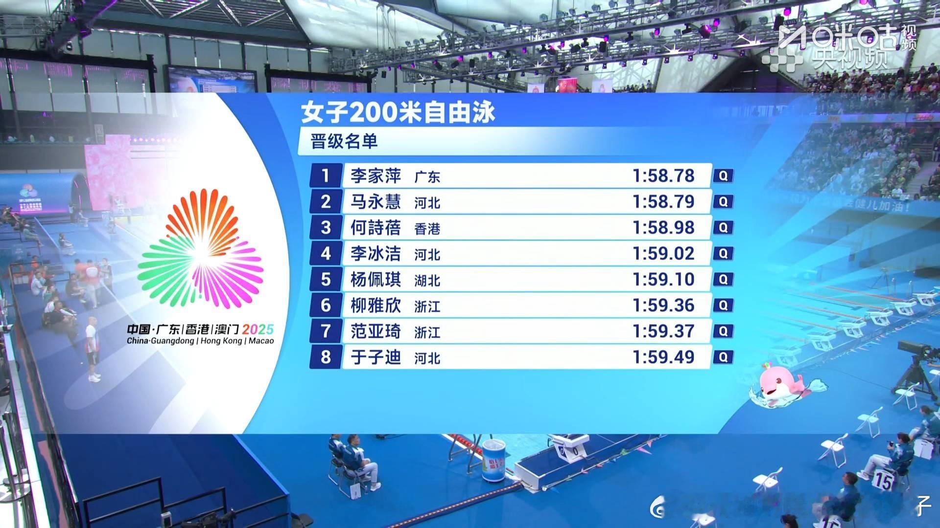 2025年第十五届全运会游泳女子200米自由泳预赛:李家萍(广东) 1:58.78马永慧(河北) 1:58.79何詩蓓(香港) 1:58.98李冰洁(河北) 1:59.02杨佩琪(湖北) 1:59.10柳雅欣(浙江) 1:59.36范亚琦(浙江) 1:59.37于子迪(河北) 1:59.49张可(河北) 1:59.72孔雅琪(浙江) 1:59.78张靖岩(河北) 2:00.03严窕珊(浙江) 2:00.10葛楚彤(山东) 2:00.18汪增悦(上海) 2:00.27劳丽慧(广东) 2:00.45馬紫玲(香港) 2:00.78排名前十六晋级半决赛