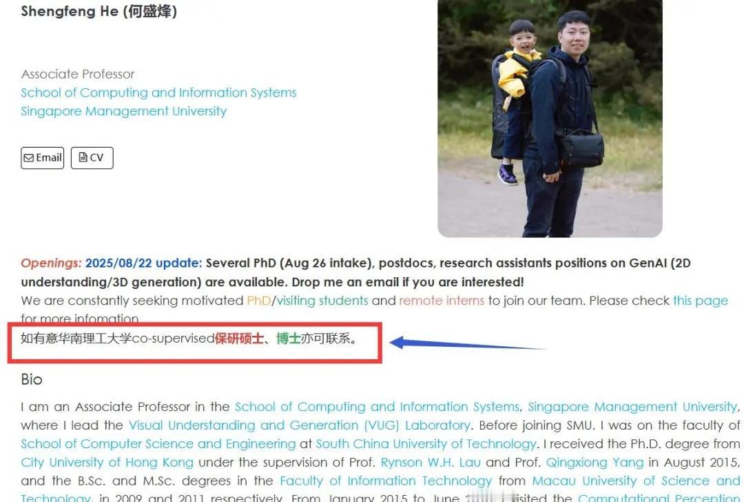 做科研的好去处!SMU hsf教授及其学生去向 何老师是新加坡管理大学计算机与信息系统学院的副教授,领导视觉理解与生成(VUG)实验室。加入新加坡管理大学之前,曾任教于华南理工大学计算机科学与工程学院。老师于2015年8月在香港城市大学获得博士学位,导师为刘文宏教授和杨庆雄教授。分别于2009年和2011年获得澳门科技大学信息技术学院的理学学士和理学硕士学位。2015年1月至6月,曾在佐治亚理工学院计算感知实验室访问,与James Regh教授合作。 研究兴趣涵盖计算机视觉、图像/视频处理和生成模型领域。IEEE高级会员和CCF杰出会员。曾荣获多项奖项,例如 PerCom 会议 Mark Weiser 最佳论文奖(2024)、李光前奖学金(2024)、谷歌南亚及东南亚研究奖(2023)以及 CCF-腾讯开放研究基金卓越奖(2020)。 担任 Pacific Graphics 2026 会议主席、ICIG 2026 本地主席、《国际计算机视觉杂志》(IJCV) 主编、IEEE Transactions on Pattern Analysis and Machine Intelligence (TPAMI)、IEEE Transactions on Circuits and Systems for Video Technology (TCSVT)、IEEE Transactions on Neural Networks and Learning (TNNLS)、Visual Intelligence 和 Neurocomputing 的副主编,以及 CVPR、NeurIPS、ICLR、ICML、AAAI、IJCAI 和 BMVC 等会议的领域主席/高级程序委员会成员。 华南理工大学 华工 华工计算机 华南理工大学计算机 华南理工计算机 保研 读博