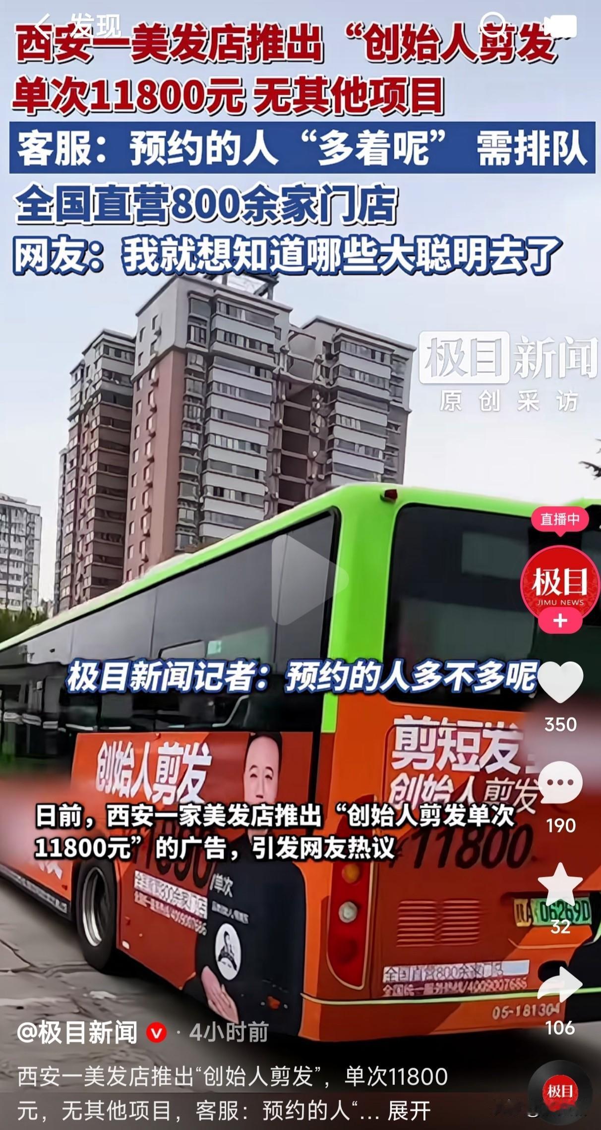 西安一美发店推出创始人剪发,单次11800元并且无其它项目,客服说预约的人很多,需要排队,这是一根一根的剪吗? 这创始人剪发到底是什么操作?而且居然要11800元,还需要预约,需要排队,这真的有人愿意去剪吗?难道创始人是世界上名气最大的理发师吗?或者是创始人剪的头发有个性,能延年益寿? 对于如此高昂的剪发价格,真是让人吃惊,难道他是数着头发一根一根的剪的吗?不知有没有大聪明愿意花那个钱去剪?这样的操作真是无法理解?