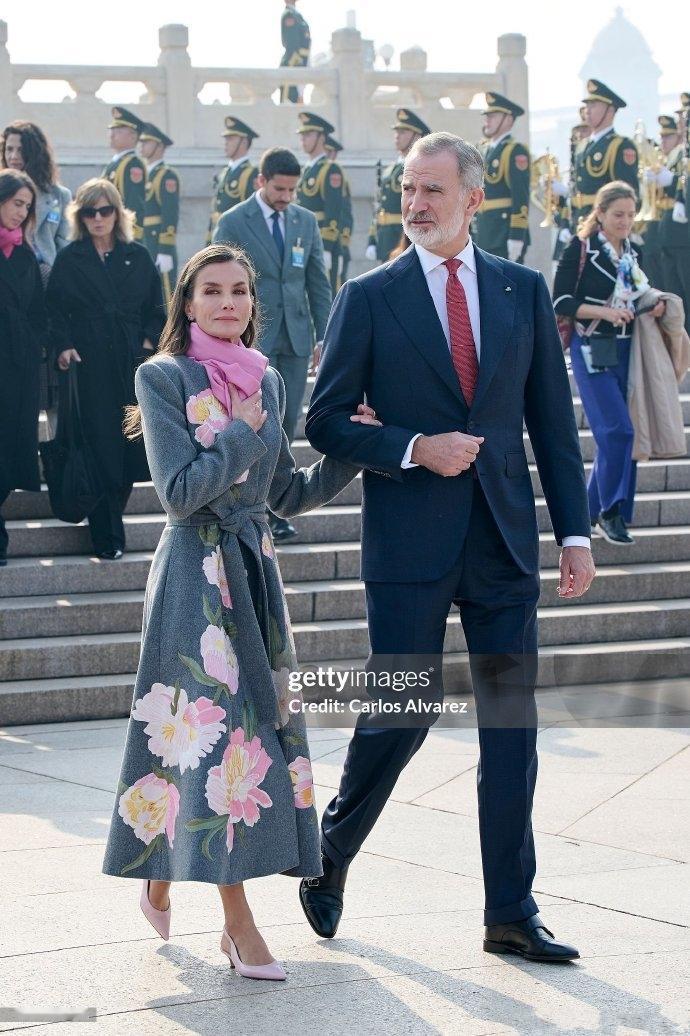 11月12日,西班牙王后和费利佩国王向人民英雄敬献花,致敬英烈! 画面中,西班牙王后穿灰色大衣,西班牙费利佩国王穿深蓝色西装,虽然他们穿的很正式,不过西班牙王后佩戴粉色围巾搭配粉色皮鞋和现场有点不是很搭配,还穿一个刺绣的大衣,刺绣的花朵非常大,另外西班牙费利佩国王也佩戴一条红色领带让不少网友感觉不太好,毕竟来这个地方是非常严肃庄重的地方。一点也不能随意,当然了他们也是刚刚参加完欢迎仪式,然后就匆忙过来,应该是来不及换衣服吧!