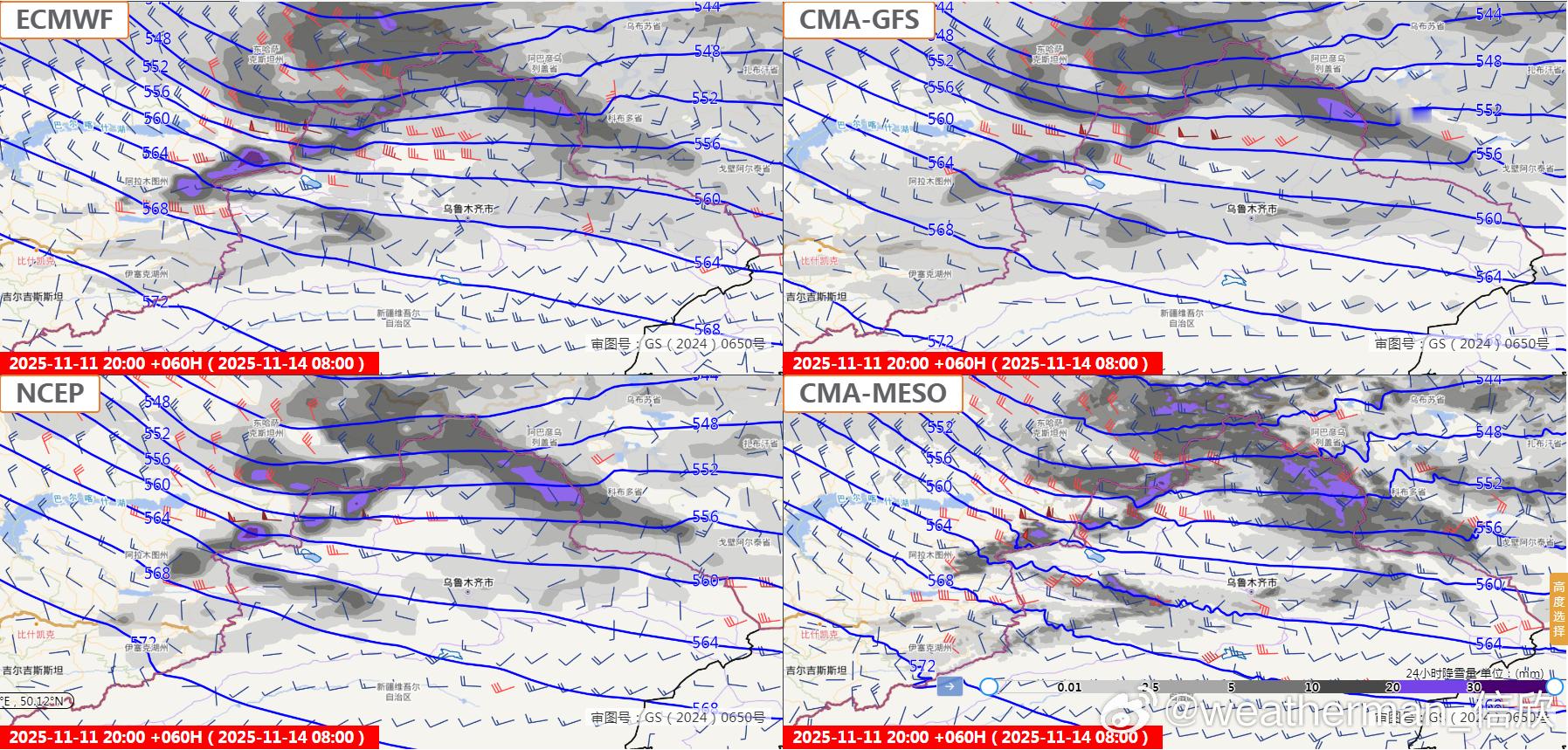 【新疆降雪分析】13日08时-14日08时,又有高空槽过境,导致新疆北部可能出现大雪暴雪。这次降雪和上周的降雪相比,降雪核心区相对偏北,主要在阿勒泰地区,富蕴-青河一线可能最强,局地可能有大暴雪。目前数值预报模式之间的降雪分布高度接近,说明预报可信度大。这场降雪可能导致5-20厘米的新增积雪。