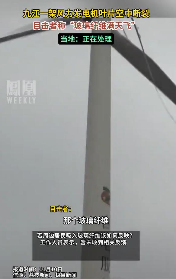 九江一架风力发电机运行时,叶片突然断裂,目击者称“玻璃纤维满天飞”。责任方正在处理,公众忧心自己的健康。 (来源:凤凰网) 11月9日,一架正在运转的风力发电机的叶片,突然断裂。大量的碎片和碎屑,随风飘舞,散落到周边的区域。 有目击者表示,看到漫天飞舞的玻璃碎片,担心自身安全受到影响,于是选择快速驶离现场。 风力发电机所属单位的负责人表示,正在对此事进行应急处理。让大家不要慌张,不要为此事分心。 附近的高速公路热线也表示,发生故障的地方,与高速的服务区比较远,责任单位已经进行处理。希望服务区的乘客不要紧张。 除了担心驾驶安全以外,很多人也担心玻璃纤维对自身健康造成伤害。 责任单位表示,这个问题需要往后推,目前主要的任务是处理现场。如果有居民吸入玻璃纤维,身体感到不适,建议到医院就诊,同时保留相关证据。这意味着,责任单位会报销医疗费。 很多网友都表达了自己的观点,有人认为一个扇叶坏了,周围的环境可能会被破坏,不再适合居住。 还有人认为,风力发电机建的有点多,很多地方的风力都没有达标,也要建立风力发电机。 其中最主要的一点是很多风力发电机都采用玻璃纤维的风叶,虽然重量轻,耐腐蚀,但是容易致癌!很多国家都禁止使用。 需要指出,现在很多风力发电机的叶片采用玻璃纤维复合材料,主要是因为价格低,但是风险也很大。 碳纤维复合材料比玻璃纤维复合材料更好,但是价格昂贵,主要应用在80米以上的超长叶片,或者海上风力发电机。 未来还将探索可回收的热塑性复合材料,以及生物质材料作为风力发电机叶片的材料。玻璃纤维叶片有可能会成为过去式,到时我们不用在为此感到烦恼!