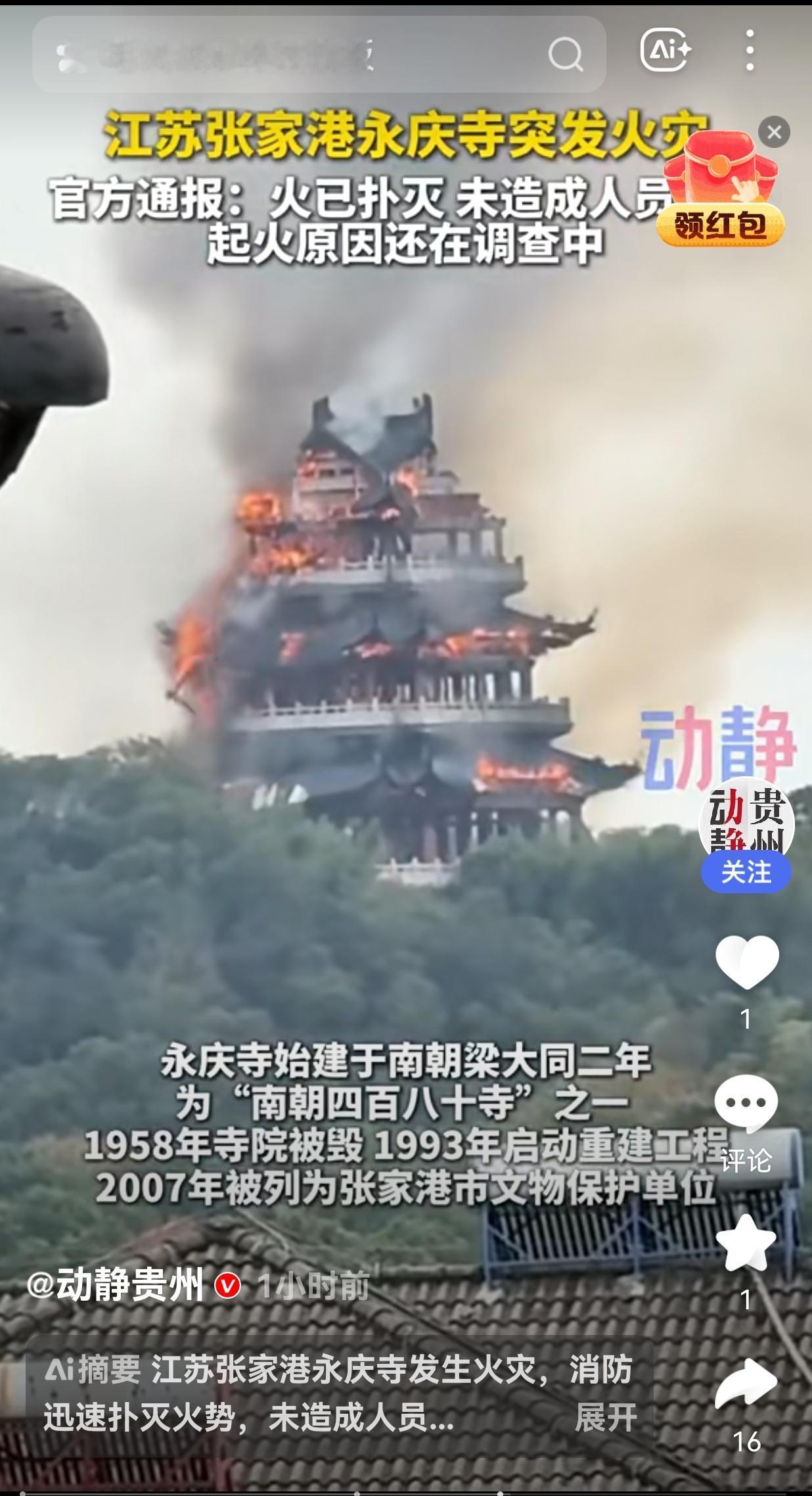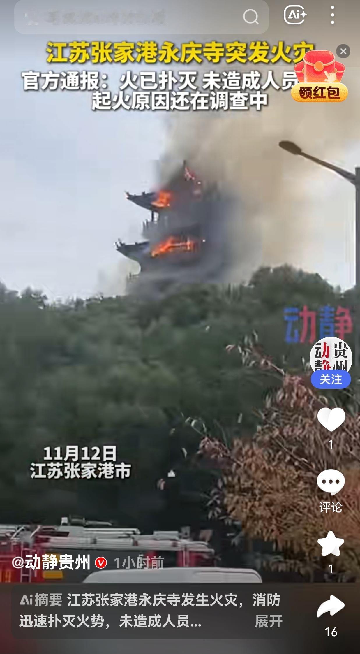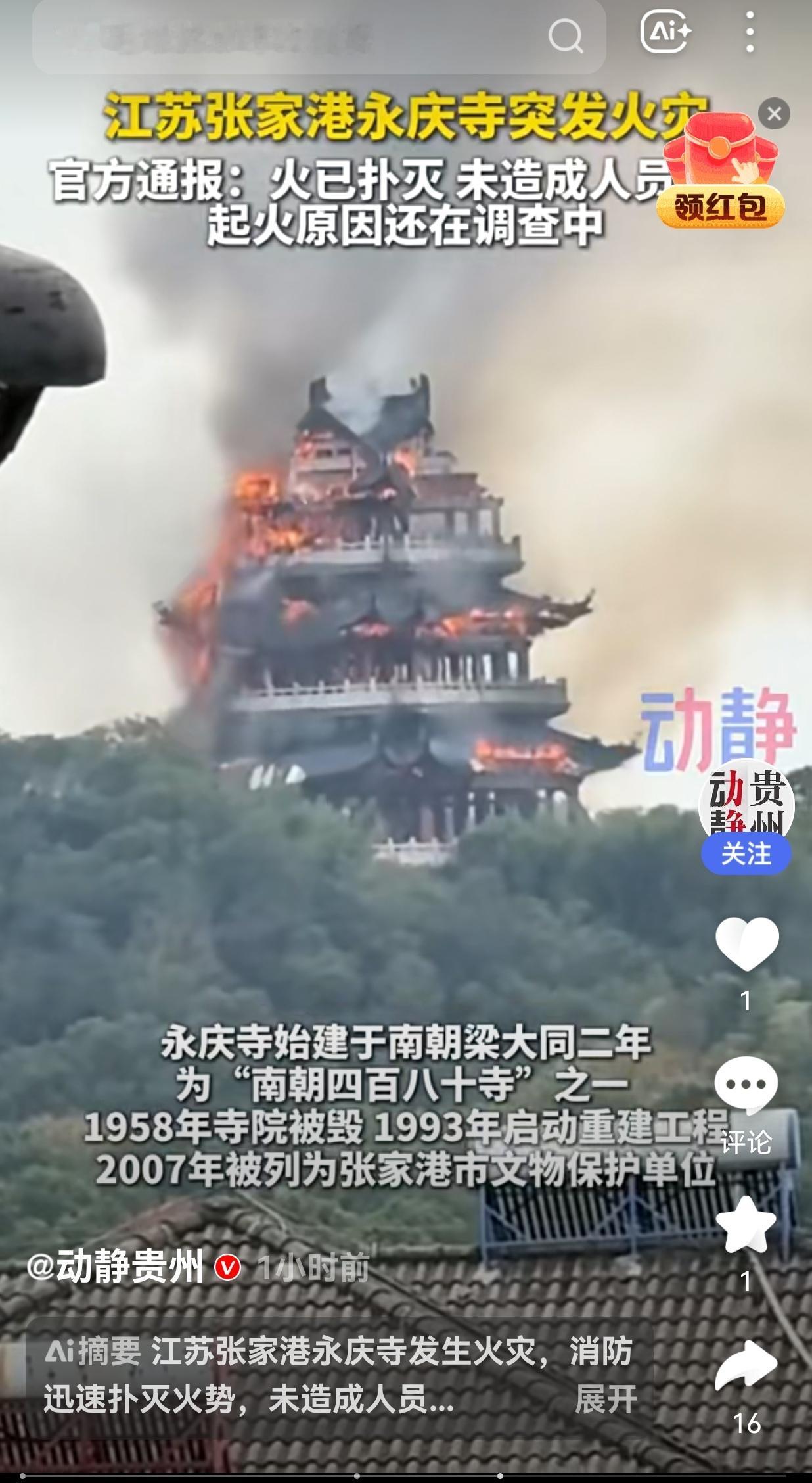 今天下午(2025.11.12)江苏苏州张家港市凤凰山景区永庆寺突发火灾。 “南朝四百八十寺”之一的永庆寺是木结构建筑,大量结构木梁让这次大火的现场火势猛烈。 “全民消防、生命至上——安全用火用电”!但愿没有人员伤亡[祈祷][祈祷][祈祷]!