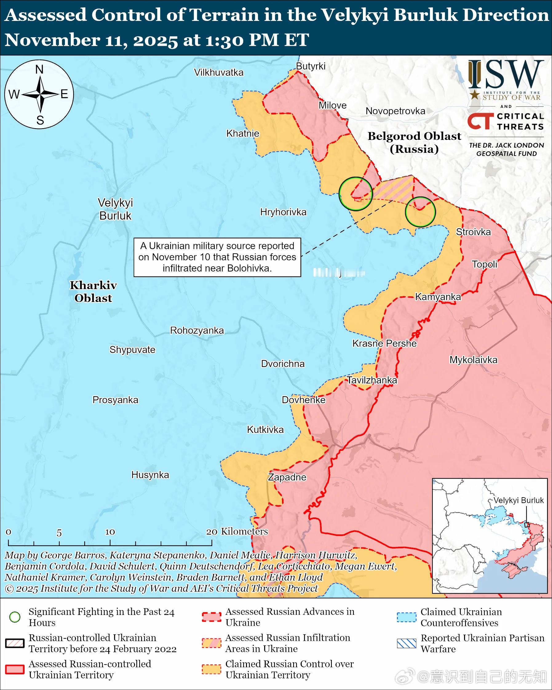 俄罗斯主要行动:乌克兰东部俄军主要行动1俄罗斯的目标:将乌克兰军队从与别尔哥罗德州接壤的国际边界击退,并使其进入哈尔科夫市的管式火炮射程之内。11月11日俄军继续在哈尔科夫州北部展开进攻行动,但并未取得确切进展。未经证实的说法:俄罗斯军事博客作者声称,俄军已推进至沃夫昌斯克南部和锡涅尔尼科夫附近(均位于哈尔科夫市东北部)。俄军于11月10日至11日攻击了哈尔科夫市东北部靠近沃夫昌斯克和沃夫昌斯基库托里的地方。 11 月 11 日,驻扎在哈尔科夫州北部的乌克兰炮兵连指挥官报告说,俄军继续在哈尔科夫州北部使用小股渗透战术。该指挥官报告说,由于乌克兰有效的电子战干扰,俄军已停止在该方向使用“柳叶刀”巡飞弹,现在正在使用可抗电子战的光纤无人机。据称与俄北方集团军有关联的一位军事博主于11月11日声称,俄军指挥部正在沃夫昌斯克方向用第127摩步团(第71摩步师,第14军,列宁格勒军区)替换第136摩步旅(第58合成集团军,南部军区)。 ISW注意到有报道称,第127摩步团是2025年6月由第200摩步旅(第14军,列宁格勒军区)扩编为第71摩步师而组建的新部队。这位军事博主指出,此次轮换发生在10月25日乌克兰袭击别尔哥罗德水库大坝(位于别尔哥罗德市东南部)之后不久,并评估认为俄军在洪水中遭受了重大损失。该博主抱怨说,第127摩步团人员配备不足,几乎全部由步兵组成,缺乏足够的后勤支援。该博主指出,该团的兵力仅为满编的50%,其炮兵部队的人员配备也仅为满编的20%。作战序列:据报道俄第 41 摩步团(第 72 摩步师,第 44 集团军,LMD)的无人机操作员继续袭击沃夫昌斯克附近的乌克兰阵地。第 83 摩步团(第 69 摩步师,第 6 集团军,LMD)的一个无人机排正在哈尔科夫方向作战。德尔哈奇夫斯卡·赫罗马达军事管理局局长维亚切斯拉夫·扎多连科于 11 月 11 日表示,俄军在科扎恰·洛潘(哈尔科夫市北部)对一辆民用汽车进行了 (FPV) 无人机袭击,造成一名平民受伤。11月11日俄军继续在韦利基布尔鲁克方向发动进攻,但并未取得进展。评估的俄军渗透行动:11月10日,一支在维雷基布尔卢克方向作战的乌克兰无人机部队指挥官报告称,俄军近期越过国际边界,进入奥德拉德内和博洛希夫卡(均位于维雷基布尔卢克以东)之间长达五公里的争议“灰色地带”。乌克兰和俄罗斯军队均未在该区域长期驻扎。该指挥官指出,俄军经常在该争议区域活动。ISW评估认为,此次事件并未改变地形控制或战区前沿(FEBA)的格局。11 月 11 日,俄军在哈特涅附近的韦利基布尔卢克东北部和奥德拉德涅附近的韦利基布尔卢克东部发动进攻。