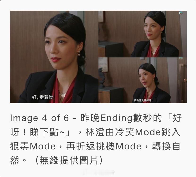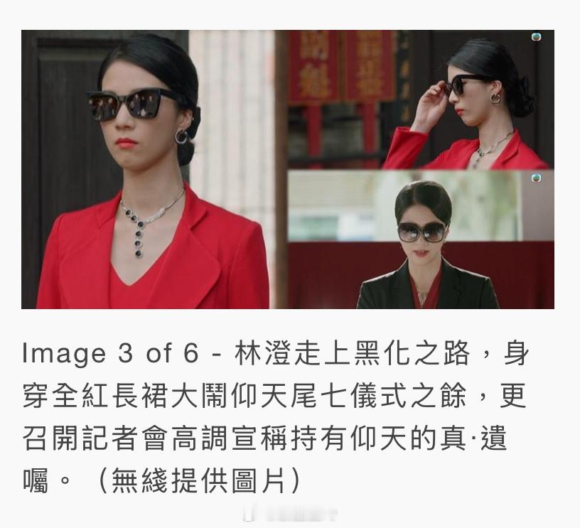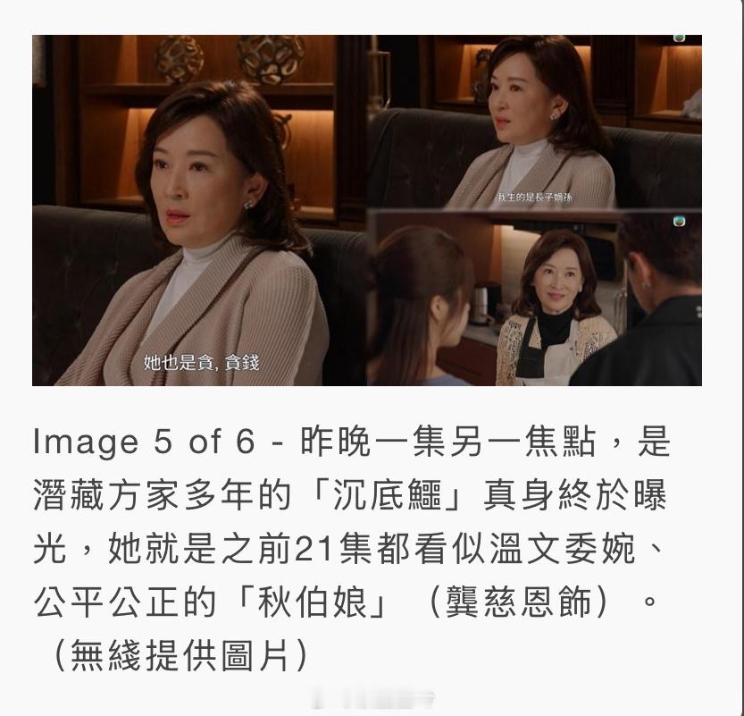 【明報即時】陳曉華逾8分鐘情緒激動戲一take完成 龔慈恩面慈心險昨晚一集是陳曉華(Hera)演技曬冷之夜。(無綫提供圖片)台慶劇《金式森林》自方仰天(郭晉安飾)第21集慘死後,方家再度迎來翻天覆地變化。應大狀(許家傑飾)宣布仰天有新遺囑後,學禮(何廣沛飾)、學勤(陳浚霆飾)及嫲嫲(羅蘭飾)先後逼令林澄搬出方家,衝突間學勤摔毀仰天留給林澄的音樂盒,嫲嫲當眾播出仰天只當林澄是「鯰魚」的自白影片,令一直深信仰天深愛自己的林澄徹底崩潰;再加上林澄極信任的高深(羅子溢飾),最終也反過來要求自己搬離方家,雖然高深奮力為林澄爭取10億遺產,但大感心碎及缺乏知音的林澄堅拒領情,最終走上黑化之路,身穿全紅長裙大鬧仰天尾七儀式之餘,更召開記者會高調宣稱持有仰天的真‧遺囑,遭學禮、學勤踩場對質,火藥味濃。昨晚是陳曉華(Hera)曬冷之夜,無論是面對高深及仰天背叛的痛心欲絕,或是以冷艷姿態化身「復仇女王」,向方家火力全開的場口,都釋出了與人設走向吻合的情緒與氣場,昨晚Ending數秒的「好呀!睇下點~」一秒即由冷笑Mode跳入狠毒Mode,再折返挑機Mode,轉換自然,獲網民讚演技躍進,封她做「周芷若2.0」:「現代版周芷若,絕境變滅絕師太」、「演出了『方家鐵娘子』嘅味道」,同時又讚陳曉華喊功出色有感染力,直指她有袁詠儀影子:「Hera個樣同把聲好似袁詠儀,柔弱之中帶點強悍」。林澄面對方家和高深背叛,及自己對方家留戀的一幕,林澄哭得肝腸寸斷又無助,當聽到高深要她離開方家時,林澄歇斯底里地一再強調:「我唔要10億,我要留低!」加上同樣勁激動的高深,張力十足。對於Hera的表現,監製林志華激讚,他透露在長達8分多鐘的「林澄遭方家圍攻」場口,Hera順利一Take過完成整個拍攝,林志華強調他當時單靠聽Hera講對白,已知道她這場戲必中:「我嗰日冇睇過Cam,淨係聽Hera講對白,都覺得啲感情全部到晒位,結果出嚟效果真係感人,Hera仲喊得好靚、好惹人憐愛。」昨晚(11日)一集另一大焦點,是潛藏方家多年的「沉底鱷」真身終於曝光,她就是之前21集都看似溫文委婉、公平公正的「秋伯娘」(龔慈恩飾)。林志華預告,結局周將會是龔姐演技大曬冷的一周,隨著劇情愈趨暴走的她,將會向觀眾展示前所未有的瘋狂一面,保證極盡官能刺激。昨晚秋伯娘自揭底牌一幕亦相當好戲,先是一邊悠閒泡茶、一邊優雅又別具城府的奸笑大談人性的醜惡:「貪嗔癡,貪係排第一位。人性就係咁喇,就算明明係假,佢哋都會當真。」、「知唔知咩係最慘?係失而復得後,再失去」。談到林澄,秋伯娘眼神充斥不屑及仇恨:「佢有咩咁可憐呀?佢咪又係貪?」之後更跌入仇恨不甘自憐Mode:「講可憐,我可憐咗好多年,我生嘅係長子嫡孫,但我竟然要委曲求全咁服侍佢哋二房,錢就畀佢哋擸晒」,配以Ending的狠毒眼神及無奈失笑,戲味十足。昨晚(11日)一集另一大焦點,是潛藏方家多年的「沉底鱷」真身終於曝光,她就是之前21集都看似溫文委婉、公平公正的「秋伯娘」(龔慈恩飾)。林志華預告,結局周將會是龔姐演技大曬冷的一周,隨著劇情愈趨暴走的她,將會向觀眾展示前所未有的瘋狂一面,保證極盡官能刺激。昨晚秋伯娘自揭底牌一幕亦相當好戲,先是一邊悠閒泡茶、一邊優雅又別具城府的奸笑大談人性的醜惡:「貪嗔癡,貪係排第一位。人性就係咁喇,就算明明係假,佢哋都會當真。」、「知唔知咩係最慘?係失而復得後,再失去」。談到林澄,秋伯娘眼神充斥不屑及仇恨:「佢有咩咁可憐呀?佢咪又係貪?」之後更跌入仇恨不甘自憐Mode:「講可憐,我可憐咗好多年,我生嘅係長子嫡孫,但我竟然要委曲求全咁服侍佢哋二房,錢就畀佢哋擸晒」,配以Ending的狠毒眼神及無奈失笑,戲味十足。(即時娛樂)