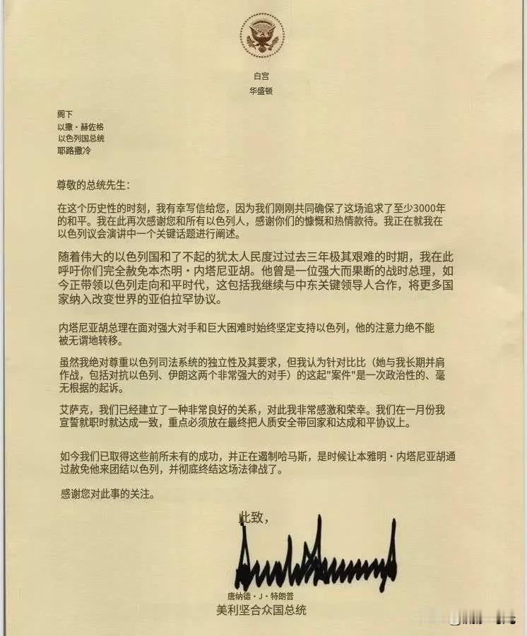 特朗普向以色列总统伊萨克·赫尔佐格递交了一封亲笔信,请求他赦免内塔尼亚胡。 译文:尊敬的总统先生:在这个历史性的时刻,我有幸写信给您,因为我们刚刚共同确保了这场追求了至少3000年的和平。我在此再次感谢您和所有以色列人,感谢你们的慷慨和热情款待。我正在就我在以色列议会演讲中一个关键话题进行阐述。随着伟大的以色列国和了不起的犹太人民度过过去三年极其艰难的时期,我在此呼吁你们完全赦免本杰明·内塔尼亚胡。他曾是一位强大而果断的战时总理,如今正带领以色列走向和平时代,这包括我继续与中东关键领导人合作,将更多国家纳入改变世界的亚伯拉罕协议。内塔尼亚胡总理在面对强大对手和巨大困难时始终坚定支持以色列,他的注意力绝不能被无谓地转移。虽然我绝对尊重以色列司法系统的独立性及其要求,但我认为针对比比(她与我长期并肩作战,包括对抗以色列、伊朗这两个非常强大的对手)的这起"案件"是一次政治性的、毫无根据的起诉。艾萨克,我们已经建立了一种非常良好的关系,对此我非常感激和荣幸。我们在一月份我宣誓就职时就达成一致,重点必须放在最终把人质安全带回家和达成和平协议上。如今我们已取得这些前所未有的成功,并正在遏制哈马斯,是时候让本雅明·内塔尼亚胡通过赦免他来团结以色列,并彻底终结这场法律战了。感谢您对此事的关注。此致,唐纳德·J·特朗普美利坚合众国总统
