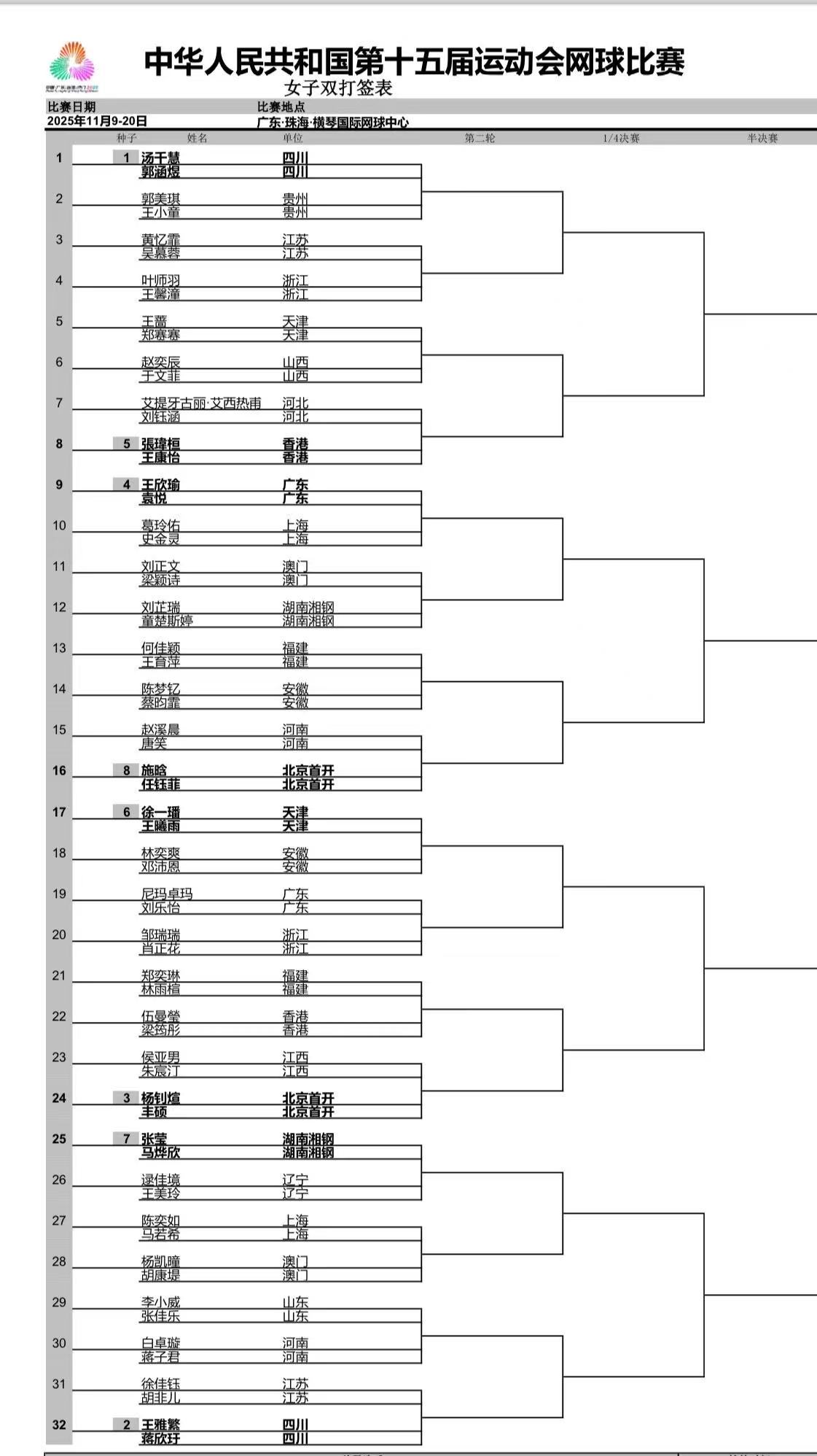 2025全运会网球女单前三种子:王欣瑜、袁悦、朱琳这也意味着郑钦文退出了本届全运