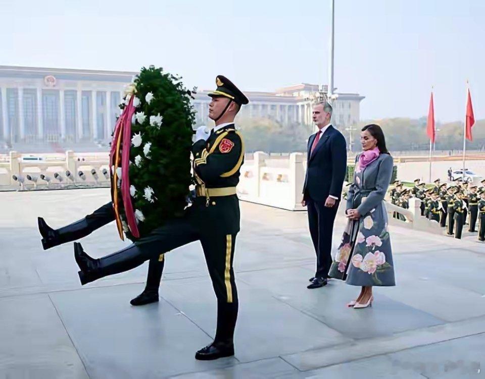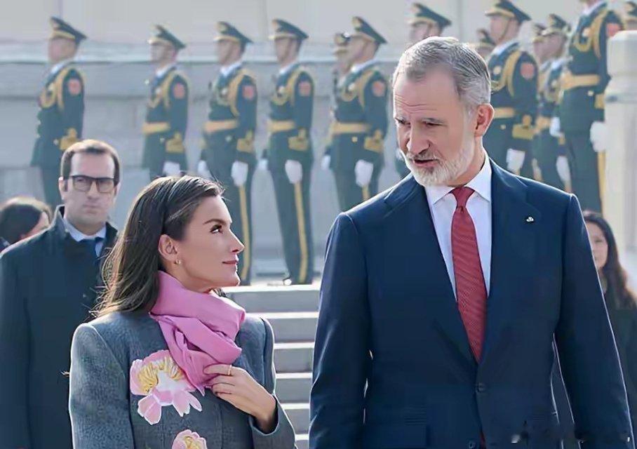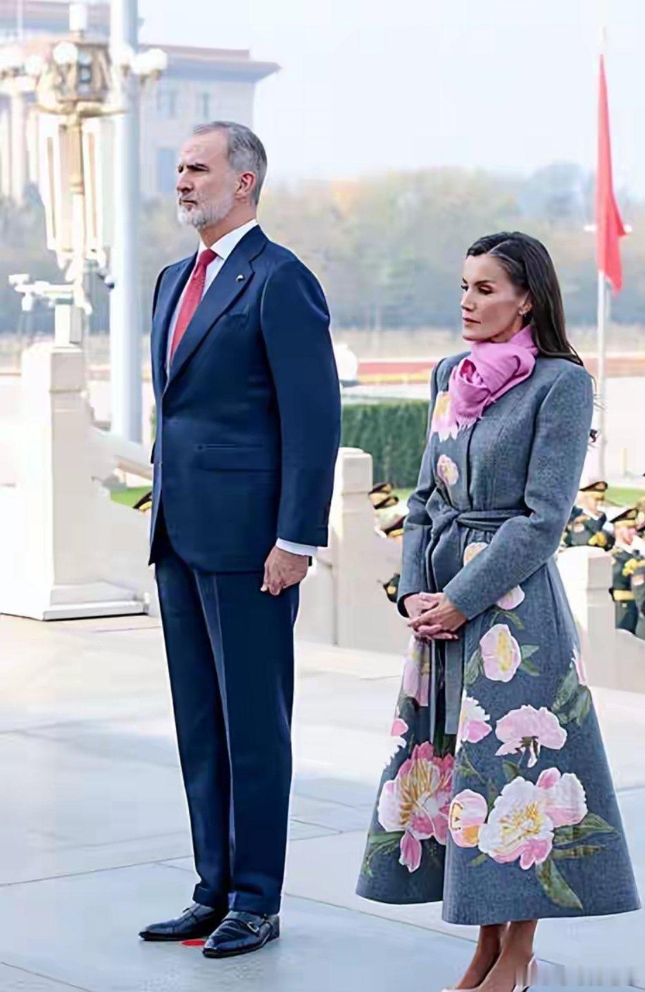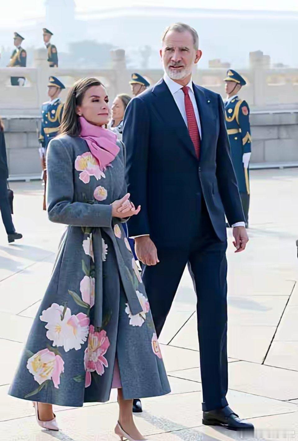 西班牙王后天安门出席欢迎仪式 造型优雅惊艳西班牙王后莱蒂齐亚亮相天安门广场欢迎仪式,整体造型简约却尽显高级感。她身着灰色花朵刺绣大衣,裙摆处鲜艳的花朵点缀极具活力;内搭粉色连衣裙,与粉色鞋子、围巾及浅粉色手包形成巧妙色彩呼应,温柔又亮眼。妆容上,她以淡妆搭配亮色系口红,粉色眼影精致用心;侧分微烫波浪发简约大气,虽白发明显却从容展现,丝毫未减优雅气质。尽管北京天气寒冷,她仍选择光腿造型,尽显端庄。据悉,国王与王后此前访问成都,昨日抵京,此次亮相尽显宫廷贵气与端庄风范。