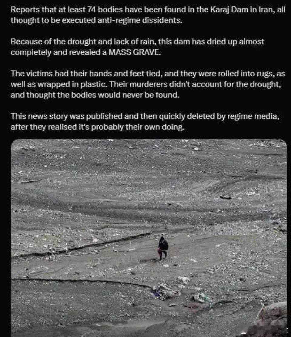 近日,在伊朗干枯的卡拉季大坝发现了至少 74 具尸体……