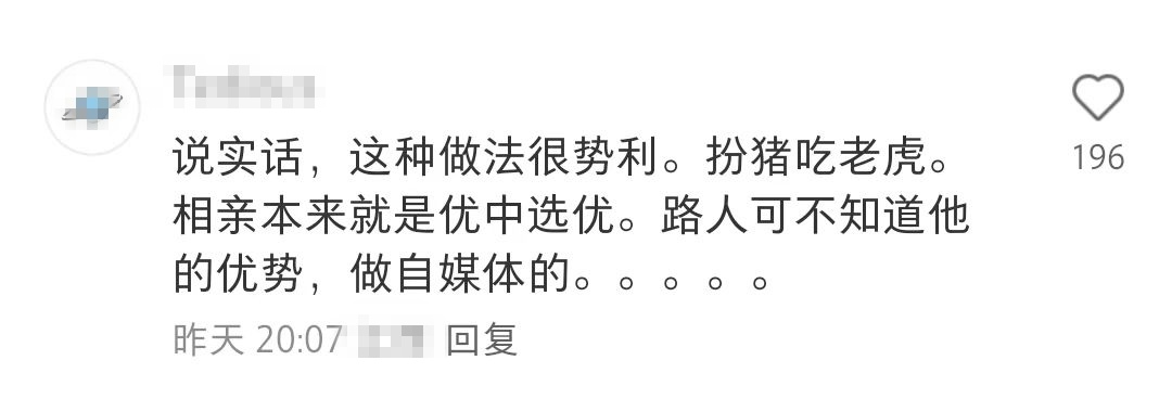 【:“看似很谦虚”】 11月12日,在近期发布的1400万粉丝Q&A中,影视飓风CEO Tim潘天鸿随机抽中了一条“去相亲”的评论,之后现身杭州相亲角。潘天鸿展示自己的相亲简历,把自己塑造成杭州本地29岁离异的人设,父亲职业快递相关,母亲照顾家庭。并称自己“计划购入车房”。然而,这位在专业领域备受推崇的创作者,却在相亲角遭遇了“滑铁卢”。潘天鸿在个人纸条上的“国内初中学历”,立马引来阿姨直言:“学历太低了”。而当坦诚离异状况时,另一位阿姨也惋惜道:“这么年轻就离异了……”一位阿姨说,“你要有几分实力拿得出来。”对此,他回应:“我的实力已经全部都在这里了。”潘天鸿(Tim),1996年出生于浙江省杭州市,毕业于英国肯特大学电影系,影视飓风工作室创始人,现任杭州星奥传媒有限公司法定代表人、经理。公开资料称公司2025年年营业额已过亿。他创办的影视飓风在B站粉丝近1500万,官方认证为2024百大UP主、2023年度最高人气奖UP主、2022年度多元创新奖UP主。2020年12月,Tim与“小鱼”余宁葳正式领取了结婚证。2024年11月5日,Tim在微博上宣布和妻子小鱼已经离婚,两人之间没有原则性问题,没有牵扯到其他的人。因婚后性格不合,为了彼此更好的发展选择分开。(新闻晨报综合)对此有网友评论道:“看似很谦虚,其实满满优越感。”还有网友评论称:“这种做法是扮猪吃老虎。”