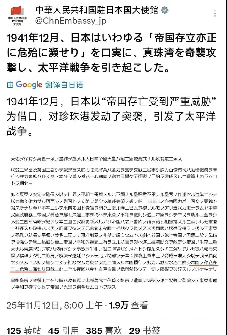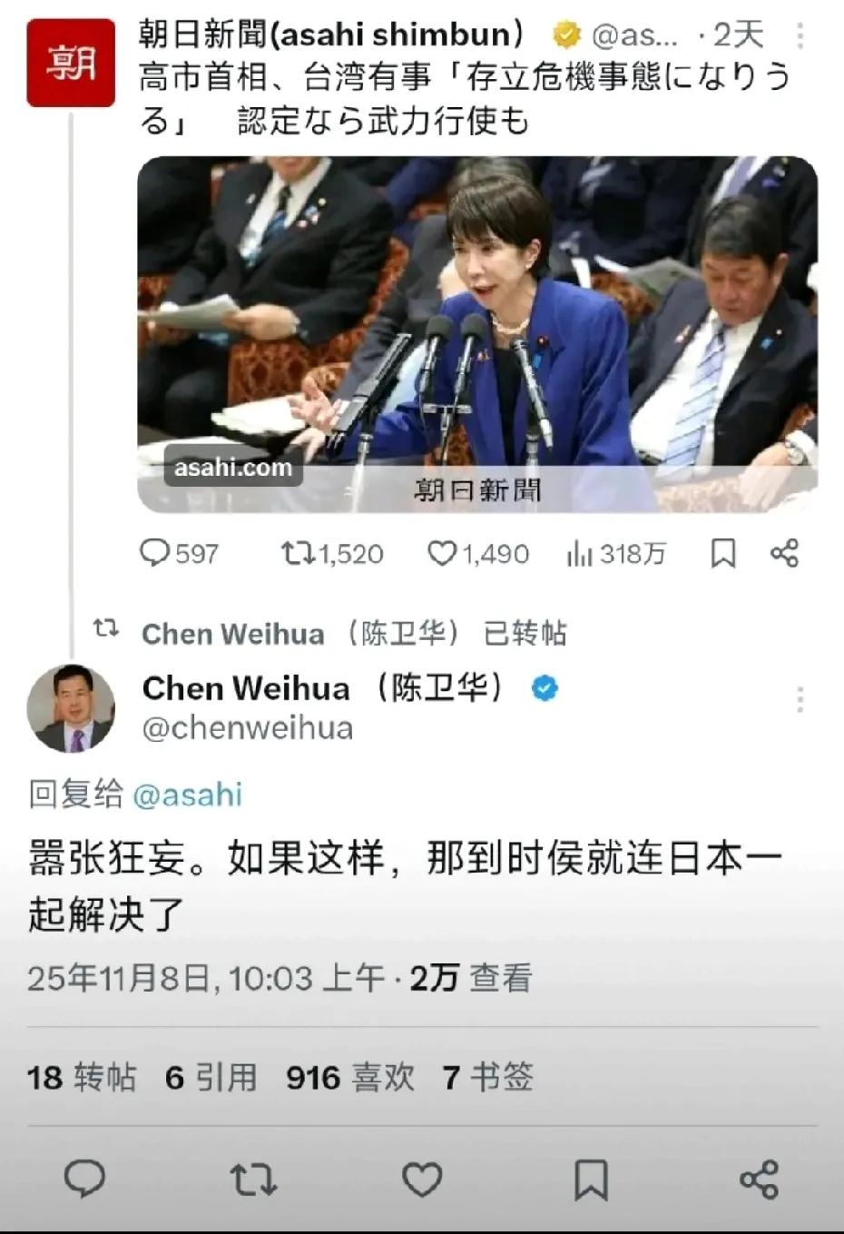 高市早苗叫嚣介入台海,中国网友反向“加油”:老账新账该清了! 日本首相高市早苗公然放话,宣称中国大陆对台动武可能构成日本“存亡危机事态”,暗示自卫队可介入台海 。这番谬论一出,“台独”势力弹冠相庆,美国政客暗自窃喜,可偏偏中国网友不怒反笑,全网敲锣打鼓喊着“千万别怂,抓紧落实”,直接把这波挑衅变成了大型“打脸现场”! 大家心里跟明镜似的:高市早苗哪是真为台海和平?分明是打着“护台”幌子,行“扩军”之实!她搬出2015年新安保法里模糊不清的“存亡危机事态”概念,把中国内政硬扯成“威胁日本生存”,本质就是想突破和平宪法束缚,为日本军事扩张找借口 。要知道,《中日联合声明》早就明确承认台湾是中国领土,现在她公然撕毁承诺,说白了就是追随美国“印太战略”,想把日本绑上分裂中国的战车,同时借“中国威胁论”煽动国内情绪,实现自己的政治野心 。 更讽刺的是,她的言论连日本人都不买账!立宪民主党党首直呼“感到危险”,前首相鸠山由纪夫直接打脸“台湾问题是中国内政,日本绝不应插手”,国会更是有人直接质问她“想把日本拖入战争吗” 。毕竟谁都清楚,台海距离日本本土千里之遥,所谓“存亡危机”纯属无稽之谈,真要介入只会让日本沦为炮灰。 而中国网友的“反向加油”,堪称最高明的反击!我们早就看透:让她可劲儿蹦跶,正好让全世界看清谁在搅浑水。台湾是中国领土不可分割的一部分,这是《开罗宣言》《波茨坦公告》确立的国际共识,也是日本作为战败国理应遵守的底线 。高市早苗一边回避日本殖民台湾50年的黑历史,一边多次参拜靖国神社,现在还想重拾军国主义野心,简直是痴心妄想! 中国从不主动惹事,但绝不怕事。台湾问题是中国核心利益中的核心,任何外部势力干涉都是徒劳。高市早苗越是挑衅,越能凝聚14亿人的统一意志;越是叫嚣,越能暴露日本右翼的真实企图。网友说得好:“正好老账新账一起算”,真要敢越过红线,等待她的只会是历史的严惩和正义的清算! 别再做分裂中国的春秋大梦了,任何企图分裂自己国家的势力,任何妄想干涉他国内政的政客,最终都只会落得玩火自焚的下场!