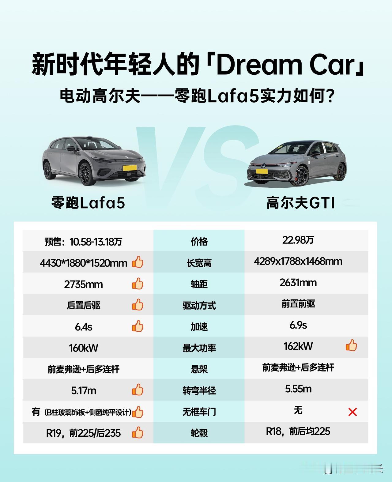 “电动高尔夫”-Lafa5 提及大众高尔夫,尤其是第一代,大家在脑海中能联想到的第一个关键词是什么,那就是国民神车,因为当时的设计背景就是经济、实用,是真心为老百姓设计的车。 后来的高尔夫GTI除了沿用了国民神车的背景,还将驾驶乐趣融入其中,每个男生的梦想里都是能有一辆自己的GTI。 零跑汽车的设计思路也来源于此,它是一辆真正致敬高尔夫的车型。也是专为年轻人设计的Dream car。情绪价值绝对拉满。 典型的溜背车造型从外观上承载了高尔夫给人的那种低趴运动的姿态,标配无框车门+B柱玻璃饰板+侧窗纯平。但是车内空间却没有缩减,光这一点就足以让很多年轻人冲了,颜值党绝对冲在前面。 打造“电动高尔夫”,光靠外观还不够打,配置要给足才能更吸引人,于是6秒级加速,更线性、直给的电驱加速体验,它来了! 前麦弗逊后多连杆独立悬架,中欧顶级团队运动化调校,它来了! 50:50黄金轴荷比,更小转弯半径,近乎完美的操控体验,它来了! 为什么说是“电动高尔夫”原因也在于此,操纵感的极致处理才是最关键的,经典永不过时,推陈出新才是零跑真正所想要表达的!