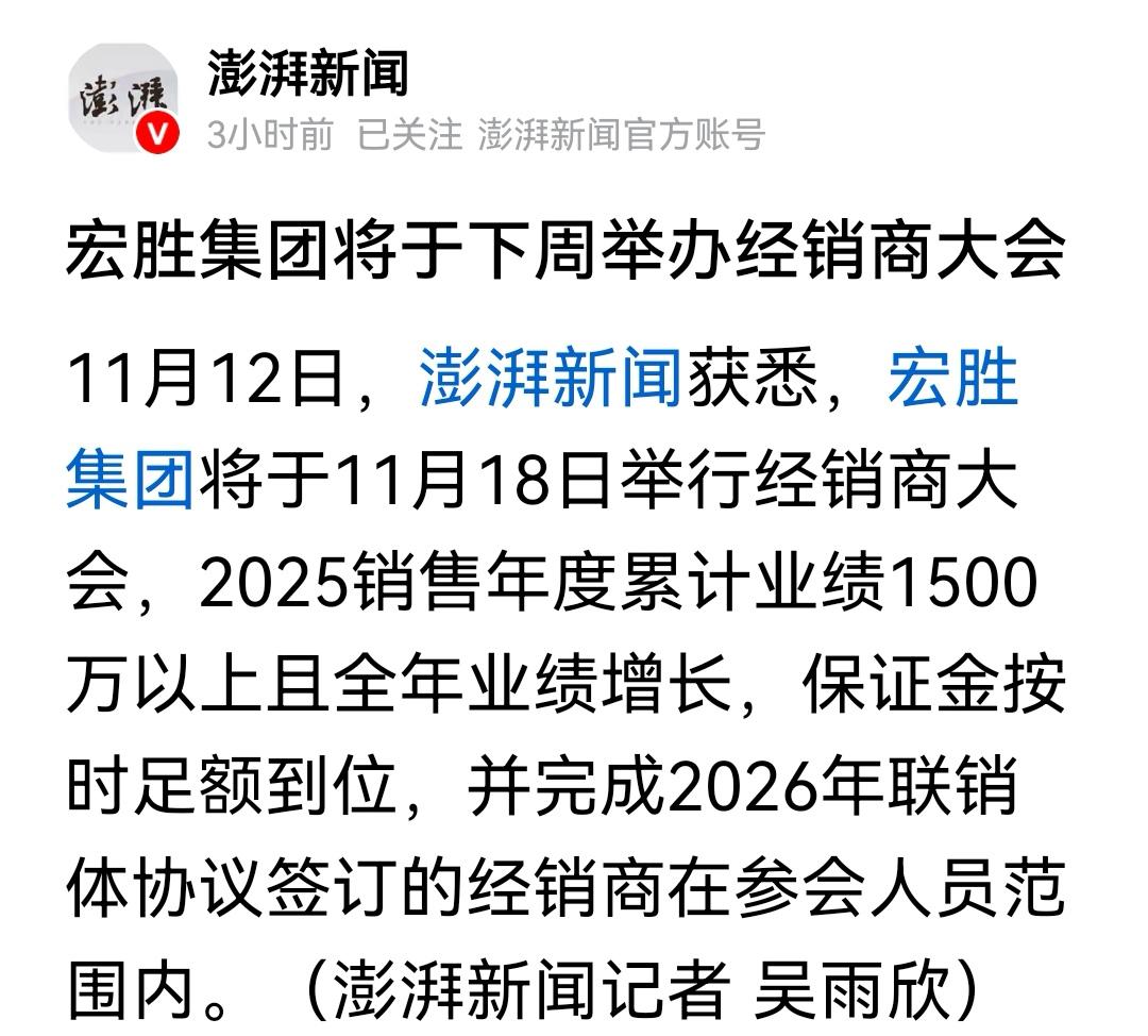 宗馥莉还是有“两把刷子”娃哈哈离辞后,大小姐掌管的宏胜饮料集团,捷报频传、好运连连。 2025销售年度累计业绩1500万以上,全年增长。 2026联销体协议签订的经销商,在参会人员之内。 保证金足额按时到位。 11月18日,准备举办经销商大会,势头挺猛、前景一片光明,颇有几分宗庆后时代的风采。 看来宗馥莉无论从为人处事、经营理念、尤其是人中国人情世故,确实改变不少,没有让众人失望!🫢