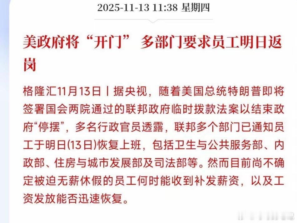 美国政府此次创纪录的43天停摆已于今日正式落幕,此前被迫停工的联邦雇员已重返工作岗位。不过,尽管复工启动,这些雇员能否顺利拿到薪资,目前仍无明确答案。停摆期间,美国经济数据发布全面停滞,这让资本市场陷入“无参考可循”的困境——就连市场高度关注的12月美联储降息与否,也因缺乏关键数据支撑而难以预测。随着停摆结束,一场新的政策博弈已然开启。未来公布的经济数据将成为美联储制定下一步货币政策的核心依据,眼下全球市场都在屏息等待这些数据的出炉,以判断后续经济走向。