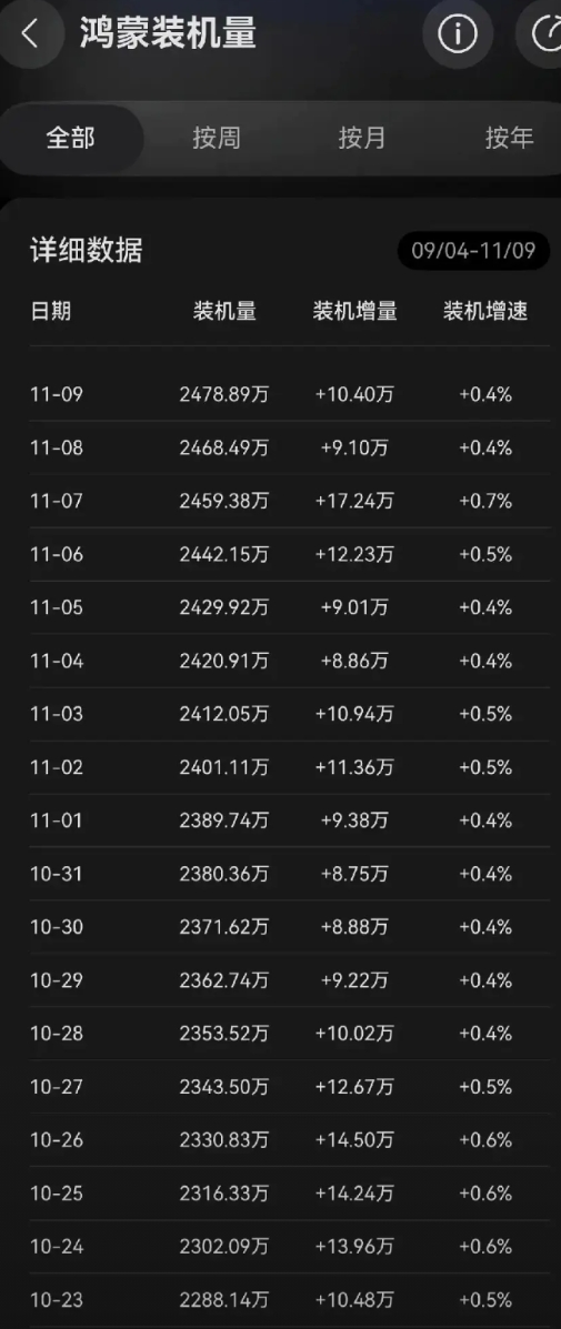 10月增量竟然没有9月多,这就很能说明问题,按理说随着生态完善用户增长会越来越快。11月现在日均只有10w左右,如果没有月底mate80发布,11月增量可能比10月还低。
