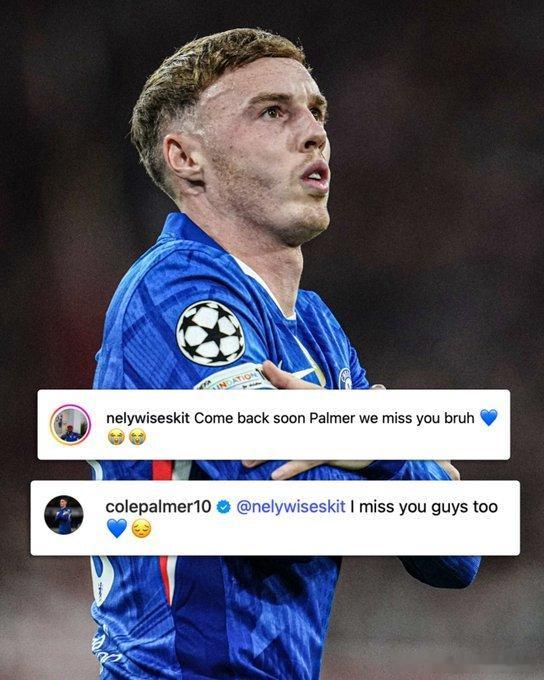 切尔西球迷留言帕尔默:“快回来吧帕尔默,我们好想你💙😭😭”帕尔默回应:“我也想念你们💙😔”据报道,帕尔默在9月21日对阵曼联的比赛中腹股沟伤势加重,预计要到11月底至12月初才能复出。