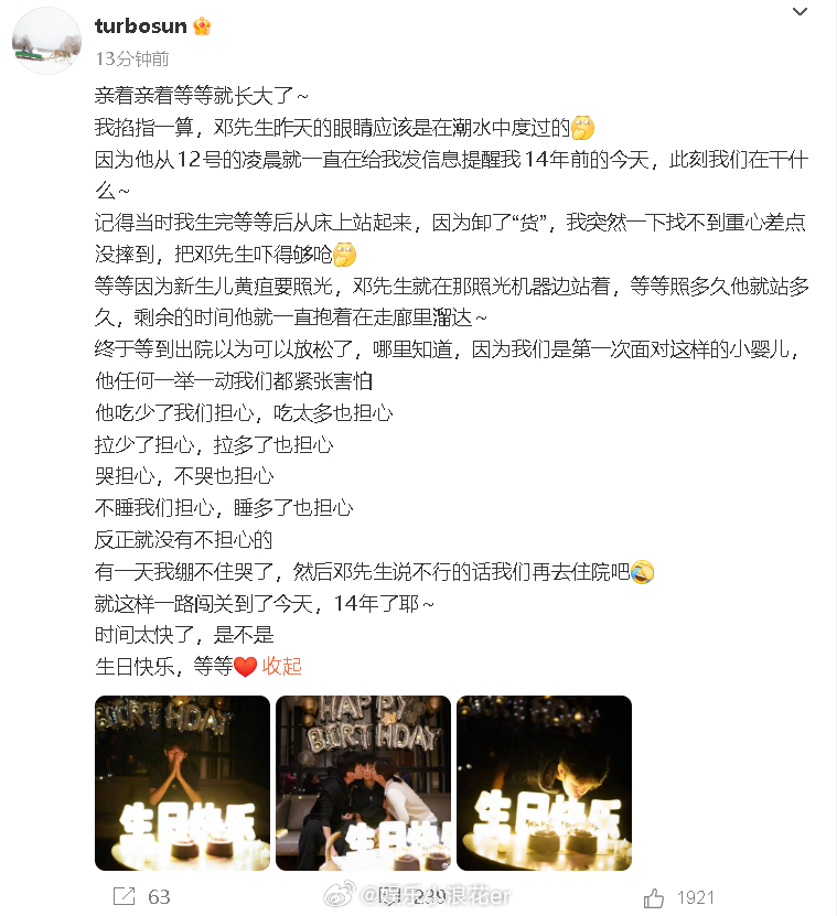 “就这样一路闯关到了今天,14年了耶~时间太快了,是不是?生日快乐,等等。”妈妈的文字好让人感动