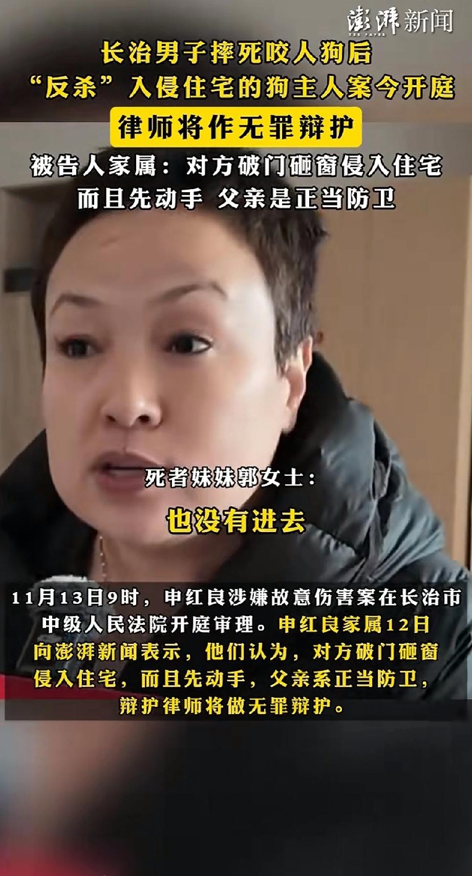 一只狗引发的命案! 大家好好看看这两位家属的面相和眼神。 左边戴眼镜的是被告人女儿,一脸无奈。 右边黑衣服的,是死者妹妹,愤怒被网暴。 被告人家属和律师都表示,因为对方是破门砸窗户侵入住宅,而且先动手,将会做正当防卫的无罪辩护。 死者家属则说,她哥只是砸窗户,进去后没有打人。 我只能说,还好里面窗户底下没有坐着老人孩子。 最让人唏嘘的是,本来两家人平时见面还会打个招呼的。 被狗咬伤案 狗咬人引发血案 庭前采访