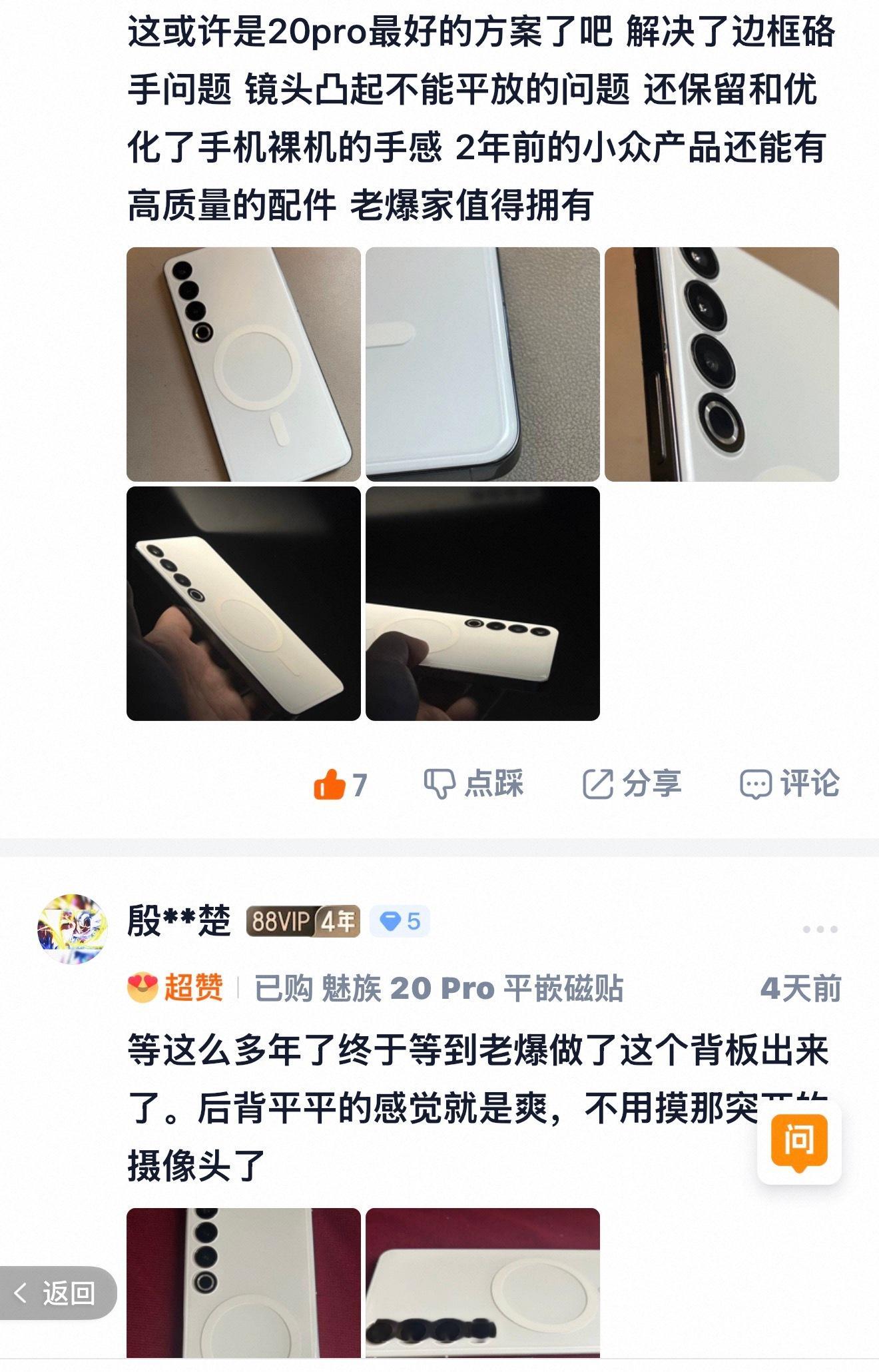 魅族20/20Pro 的平嵌磁贴卖了有185个了,非常感谢大家的支持,甚至有朋友特意去淘了一个老机20回来。这可能就是情怀的延续吧这个东西大家晒单也很热情,我就不一一晒了,大家的评价我都有反复看。最开始,很多人不理解为什么要做这个玩意,但是我相信我的直觉以及我自己用上后的感受,我坚信会有人跟我一样为之心动。 大家希望我们做的机型有点多,但是目前搞起来确实很慢,我们并没有偷懒,供应商也在全力配合,供应商也是每天晚上加班加点给我们打样做货,前期磨合可以这样,但是后续还是得回归正常节奏。