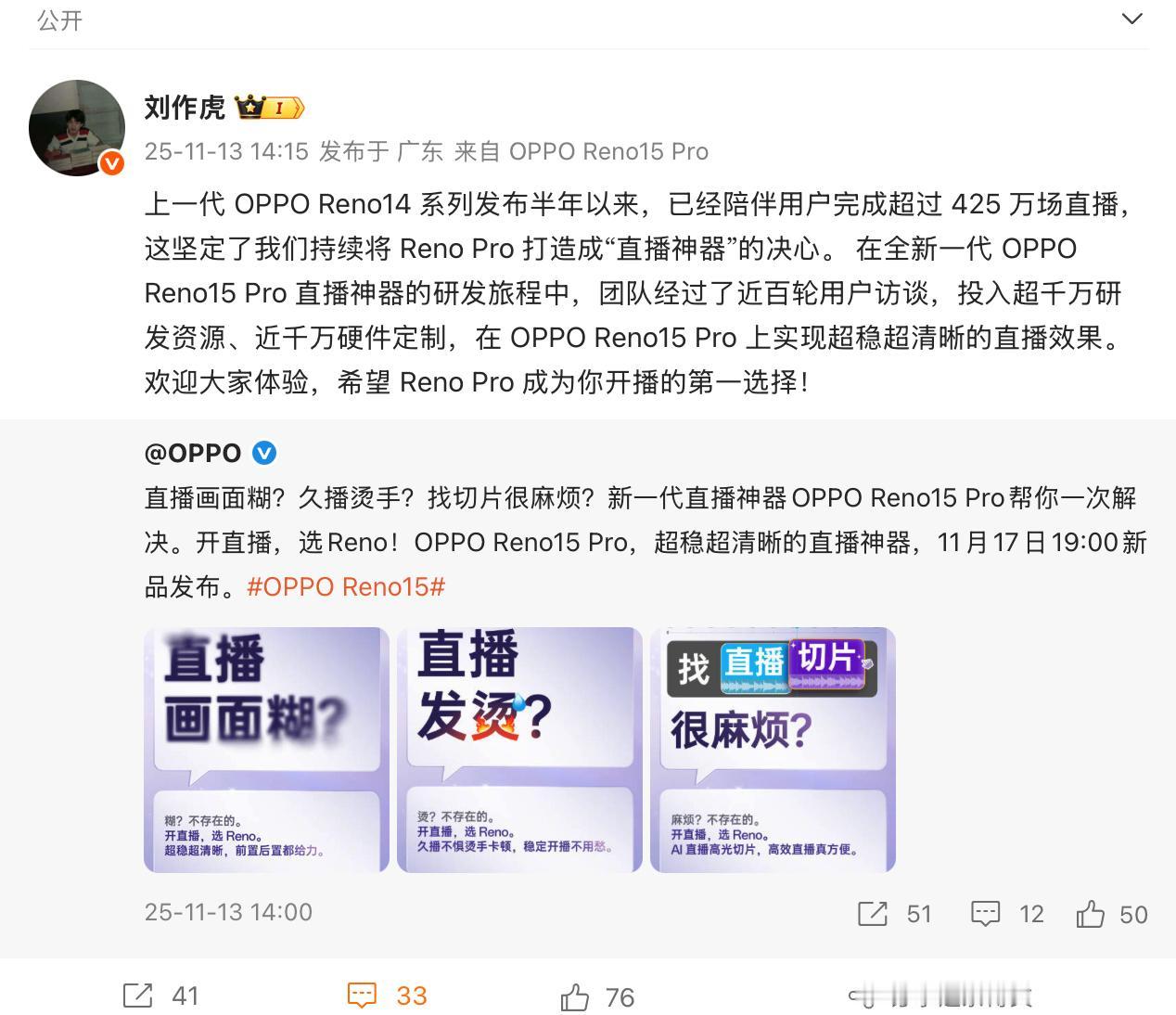 OPPO刘作虎:Reno15 Pro直播投入超千万研发资源、近千万硬件定制。
