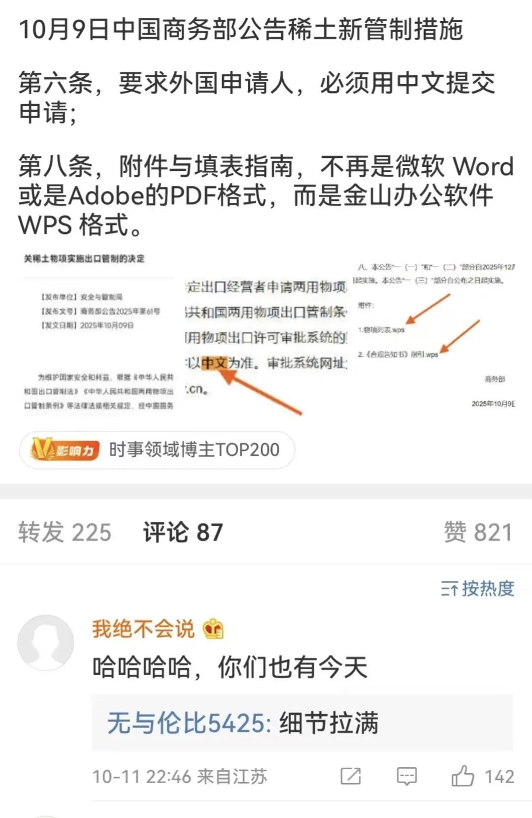 解气,外国人申请稀土使用, 必须使用中文填表,表格填报指南和附件, 只支持WPS格式,不支持微软Word或Adobe PDF格式。 欧美客户,尤其是欧洲客户,一直以来都习惯于填全英文的各种表格,现在突然要求用中文填写,这对外贸行业尤其是外贸单证工作者,将是一项新的挑战。 不是说我们不会填中文表格,而是突然间的要求,肯定会影响到订单的执行和出货的时间。 前不久,各国被迫停掉的某些政策,遭到了各国舆论的批评声,现在突然间要求填中文表格,是不是又要重新玩政策的风格转换? 更可怕的是,如果再强制要求固定格式,比如标题用方正小标宋简体二号字体,正文用仿宋_GB2312三号字体等,那就真的惨了。 稀土出口禁令 稀土关税