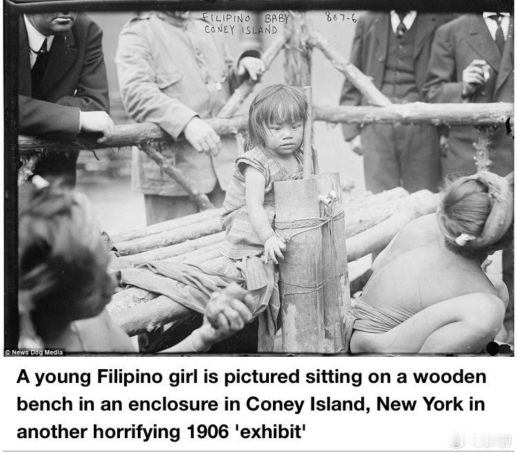 老照片:一名年轻的菲律宾女孩坐在美国纽约康尼岛一个围栏里的木凳上,这是1906年另一个令人毛骨悚然的“人类动物园”展览。在19世纪后期以及20世纪50年代前的大部分时间里,非洲人、美洲原住民以及亚洲人,常常会被欧洲和美国人被当作展品饲养在动物园里。