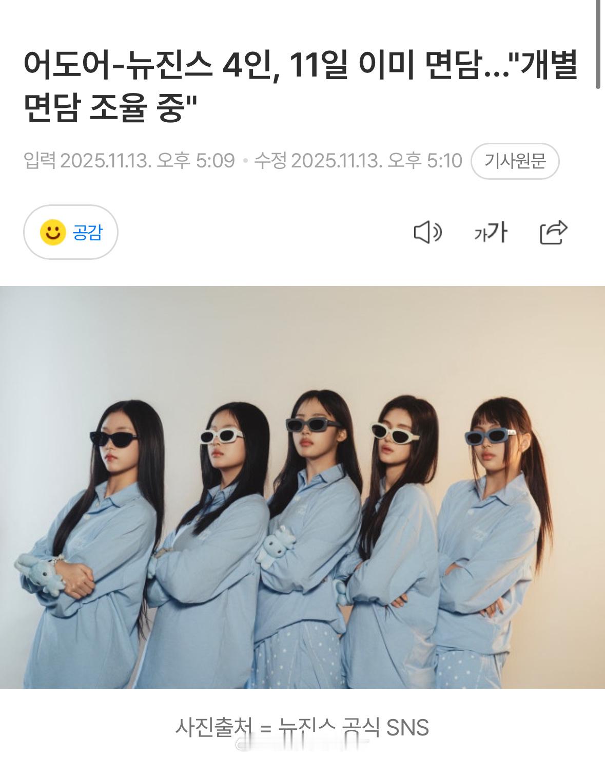 据韩媒,在11日,包括Hyein和Haerin在内的4名NewJeans成员,与家人一同与ADOR代表李道京进行了会面。据悉,Minji、Hanni、Danielle三人中,当时有两人留在国内并参加了面谈,另一人则因“正在南极停留”未能出席。但在会面之后,只有Hyein和Haerin单独向ADOR表达了回归意愿,而参与面谈的两位国内成员仅传达了重新开始活动的前提条件后便离开了。12日Minji、Danielle和Hanni发表的与所属公司分开的声明,也是得知Hyein和Haerin宣布回归ADOR的消息后,紧急作出的决定。据相关人士透露,三人实际上在得知Haerin和Hyein决定回归的消息后,立即尝试联系ADOR方面,但因未能马上得到回应,便发布了事先准备好的声明。ADOR回应此事:“关于见面的报道是事实,但无法确认内容”,对双方的讨论内容保持沉默。