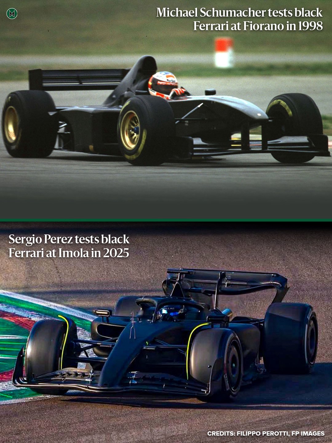 黑色法拉利F1的两次测试:1998年在菲奥拉诺,舒马赫开F300;2025年在伊莫拉,佩雷兹开SF23……📷️ Motor Sport magazine