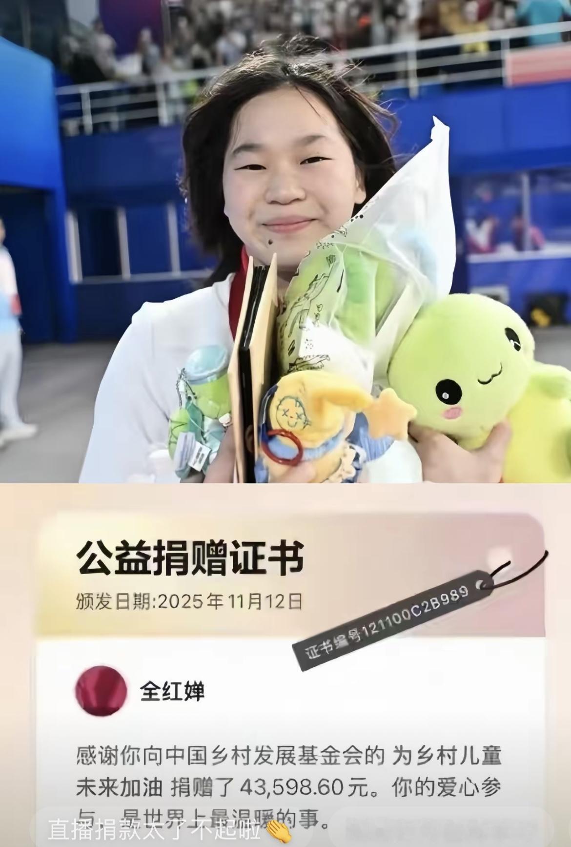 别再只夸全红婵能跳了!她捐钱的样子,才是年轻人最该学的清醒总有人说全红婵背后有高人指点, 不然十八九岁的小姑娘,怎么能把直播四万多收入全捐出去?可我偏觉得,这哪是靠“指点”,分明是刻在骨子里的纯粹。 这个年纪的很多人还在伸手向家里要生活费,纠结买新款球鞋还是化妆品,她却把镜头前的收入,毫不犹豫捐给需要的人。没有华丽的口号,没有刻意的炒作,就这么安安静静做了,这份通透比任何技巧都动人。 我们总盼着年轻人有榜样,可榜样从不是完美的“神”,而是像婵妹这样,守住本心,把善意藏在行动里。比起追捧她的冠军光环,不如多学学这份“不把得失放在眼里”的清醒。 你被全红婵的这份纯粹打动了吗?来评论区说说,你觉得年轻人最该向她学什么~