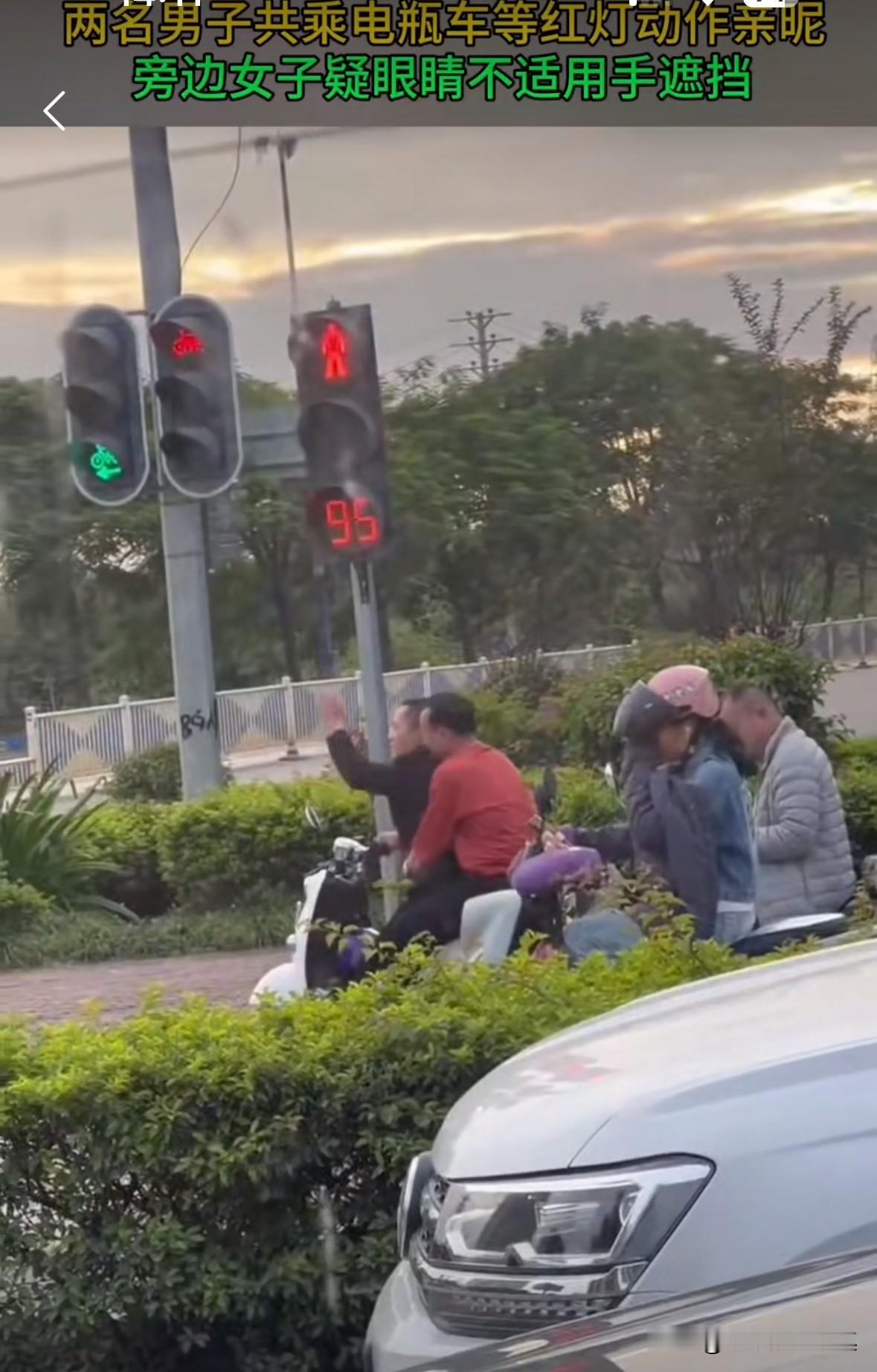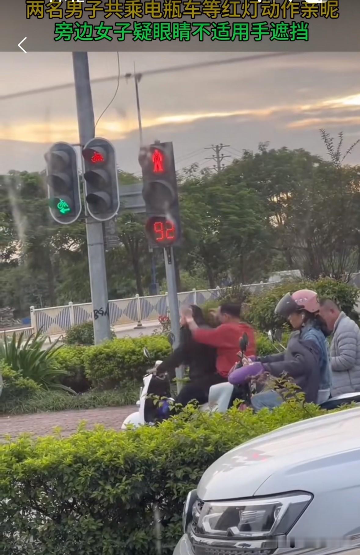 两个中年男子同骑一辆电瓶车,而且举止非常亲密。 后面的红衣男子紧紧的抱着骑车的男子,而且两人聊天时不时的哈哈大笑。 旁边等红绿灯的女子,不好意思的用手捂住眼睛。 不过这样的亲密接触在外面真的会让人误会。 我觉得这就是男人之间的友谊吧,很纯粹,能两人一起开怀大笑,伤心时放声大哭。街头亲密行为