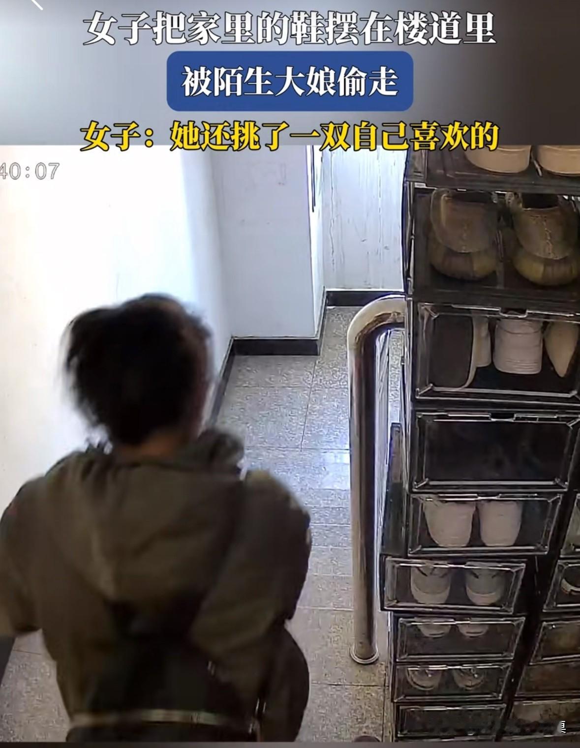 女子把鞋柜放在楼道里,一位大妈看着鞋柜里的鞋挺好看的,于是挑了一双自己喜欢的直接偷走了! 看大妈这放慢脚步的动作和神态,应该是经常干这些偷鸡摸狗的事情! 但是她忽略了一点,不知道业主家门口安装了摄像头,她偷鞋的全过程被拍的清清楚楚! 丢人丢大了,建议打印点宣传页,在小区里发一发。楼梯间鞋柜