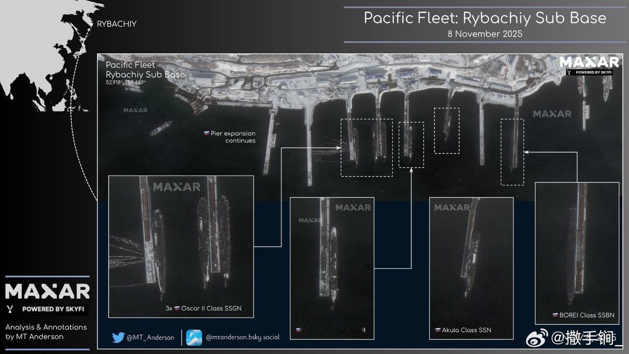 俄太平洋舰队潜艇部队司令部雷巴奇潜艇基地卫星图,各类俄罗斯海军核潜艇琳琅满目,该基地位于堪察加半岛彼得罗巴甫洛夫斯克附近。从卫星图中左边3艘是奥斯卡-II级949А型攻击核潜艇,中间左2是1艘885M型“亚森-M”级多用途攻击型核潜艇,中间右2是1艘“阿库拉”II型攻击核潜艇,最右边是1艘955级“北风之神”战略导弹核潜艇。
