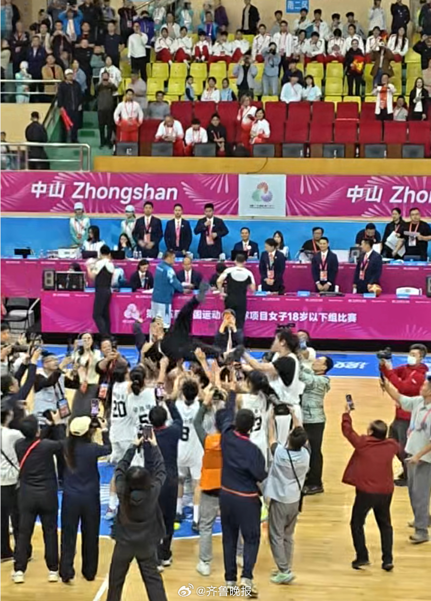 【张子宇31分,山东U18女篮96:73轻取江苏摘金】11月13日晚,第十五届全运会女篮U18组决赛在中山沙溪体育馆打响,山东队与江苏队争夺冠军。拥有身高2米24的超级新星张子宇的山东队,以96:73轻取对手,成功摘得该项目金牌。比赛开局,张子宇4投4中,包揽了全队前8分,还抢下了多个篮板;江苏队则是依靠效率极高的三分球投射咬住比分。末段山东队主动缩小阵容提速,多次打成快速反击,逐渐拉开比分,以26:21结束首节。首节比赛,张子宇7投6中摘得12分,另外还有3个篮板入账。江苏队则是出手了10记三分球,命中率达到50%。次节开始,山东队继续小阵容,张子宇在板凳席待命。但球队在进攻端受阻,2分多钟没有运动战进球,仅靠罚球进账4分。张子宇登场后成功破荒,在篮下接连得手。同时江苏队外线投射效率下降,山东队一举将分差扩大到两位数。次节比赛,山东队单节轰出30分,确立领先优势,以56:37结束半场。易边再战,张子宇先发出战,带领山东队打出6:4后江苏队叫出暂停。随后双方陷入缠斗,进攻效率也随着体能流失而下降,7分多钟的时间战成单节12:12平。不过山东队一直保持着15分以上的领先优势,三节战罢,山东队77:57领先。末节比赛,山东队继续保持20分左右的分差,将主动权牢牢掌握在手中。比赛也彻底失去悬念,张子宇早早“打卡”下班观战,最终,山东队成功登顶。数据方面,张子宇31分10篮板1盖帽,刘柯彤17分8篮板,孙瑞阳15分3篮板3助攻,姚子萱11分6篮板6助攻。江苏队方面,贺思瑶23分5篮板5抢断,谢琦睿11分6篮板2助攻,李沅珊13分2篮板。
