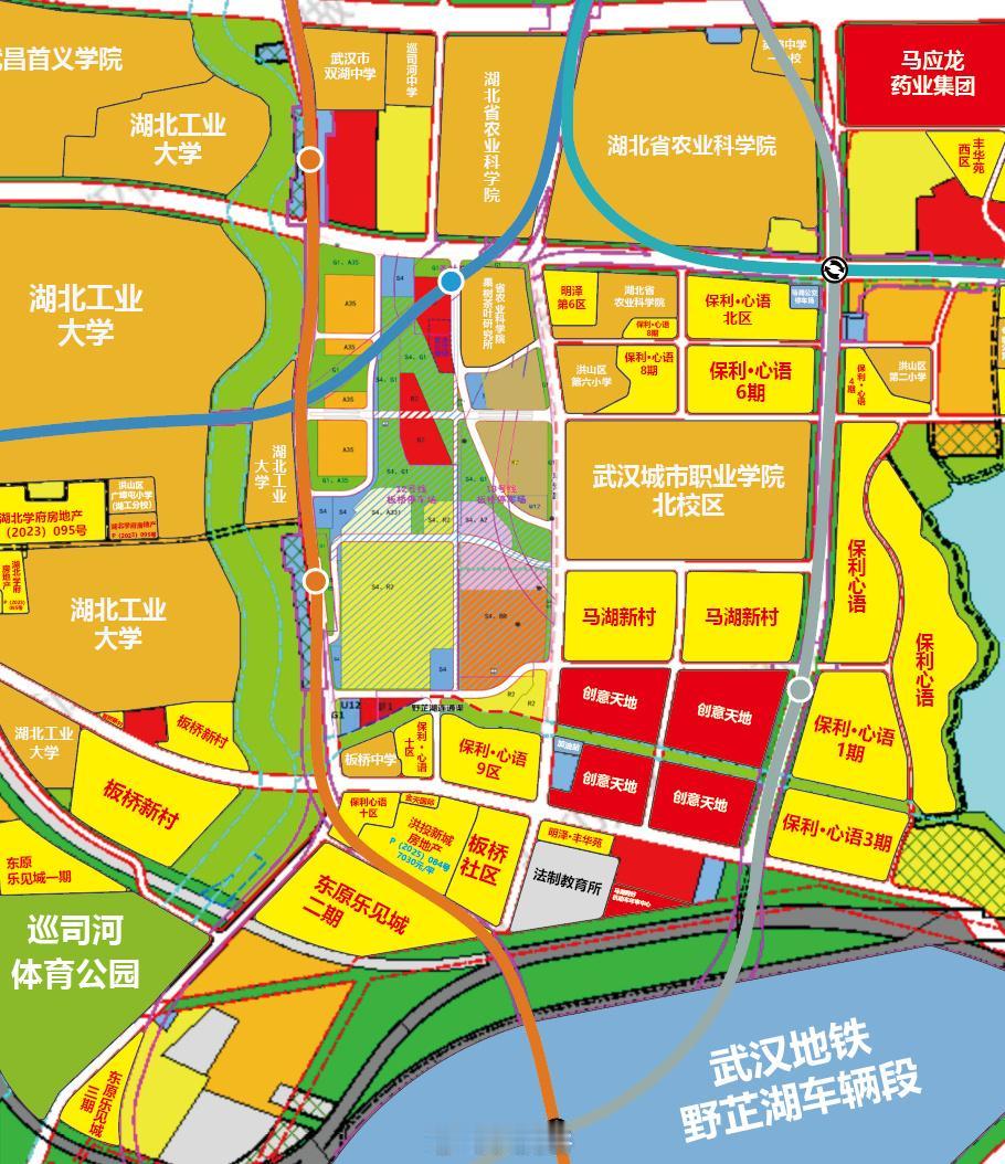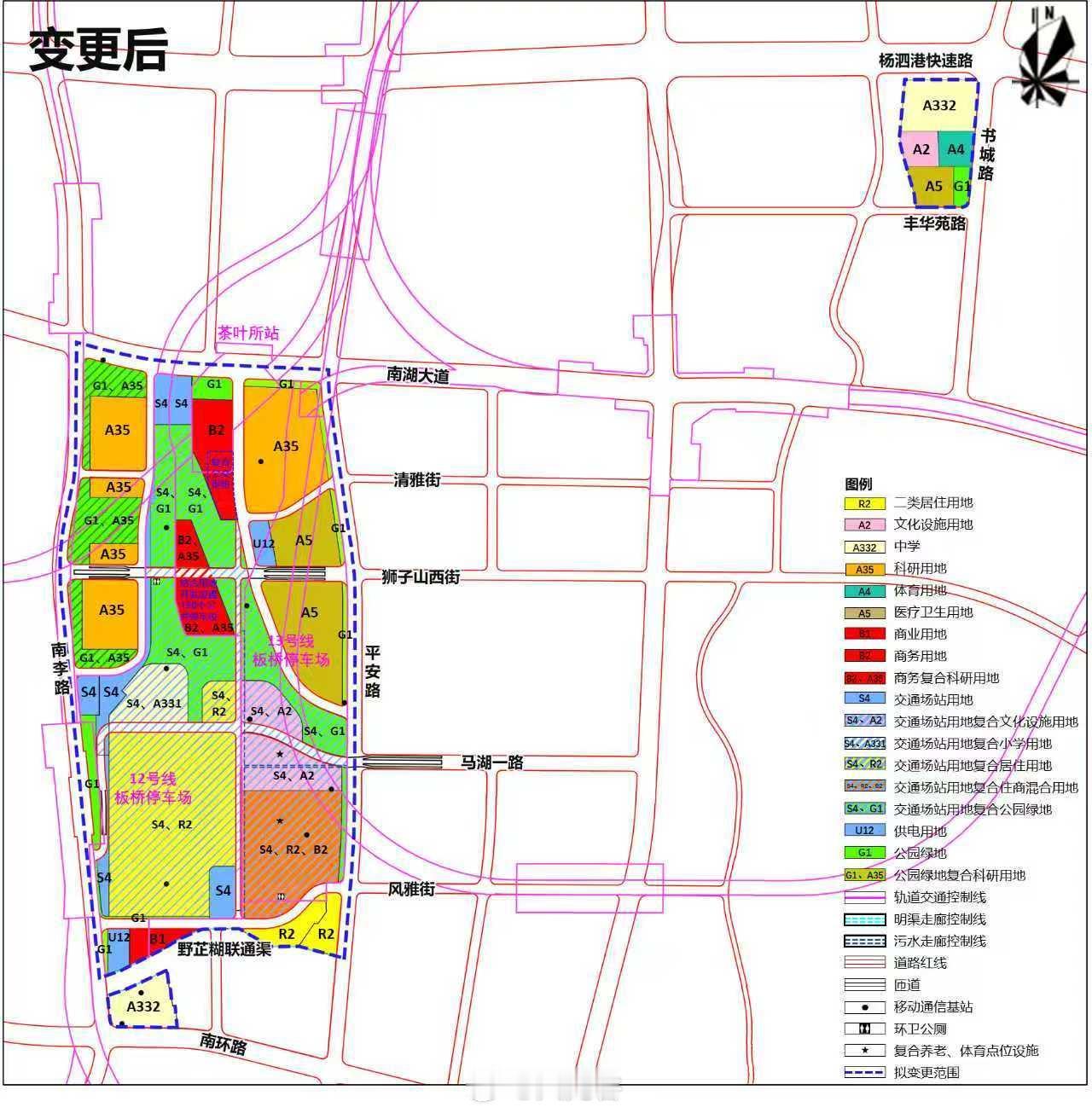 南湖板桥TOD用地大调整! 6月13日,洪山区自然资源和城乡建设局发布了主城区A140702、A140705管理单元控制性详细规划导则变更 征求利害关系人意见公示。 为支持轨道交通12号线板桥停车场建设,拟对主城区A140702、A140705管理单元控制性详细规划导则局部用地进行变更。 项目名称:主城区A140702、A140705管理单元控制性详细规划导则变更 四至范围:东至平安路、南至野芷湖连通渠、西至南李路、北至南湖大道。 申请变更内容:结合南湖副中心实施性规划、12号线板桥停车场及周边区域城市设计,主要进行了四方面优化:一是12号线板桥停车场范围主要控制为交通场站用地,商业用地,交通场站用地复合居住用地、小学用地和公园绿地;二是13号线板桥停车场范围主要控制为体育设施用地,居住用地,交通场站用地复合商住混合用地、公园绿地和文化设施用地;三是结合12号线茶叶所站规划布局商务用地;四是沿南李路和南湖大道规划布局科研用地、公园绿地、公园绿地复合科研用地。 公示日期:2025年6月13日——2025年6月22日 据悉,2023年2月21日,中信建筑设计研究总院发布了位于南湖12号线桥桥停车场上盖开发项目效果图。用地面积:25.7万㎡,建筑面积:28.3万㎡。武汉市轨道交通12号线车辆段采用“地上车场+上盖物业”的复合开发建设方式。