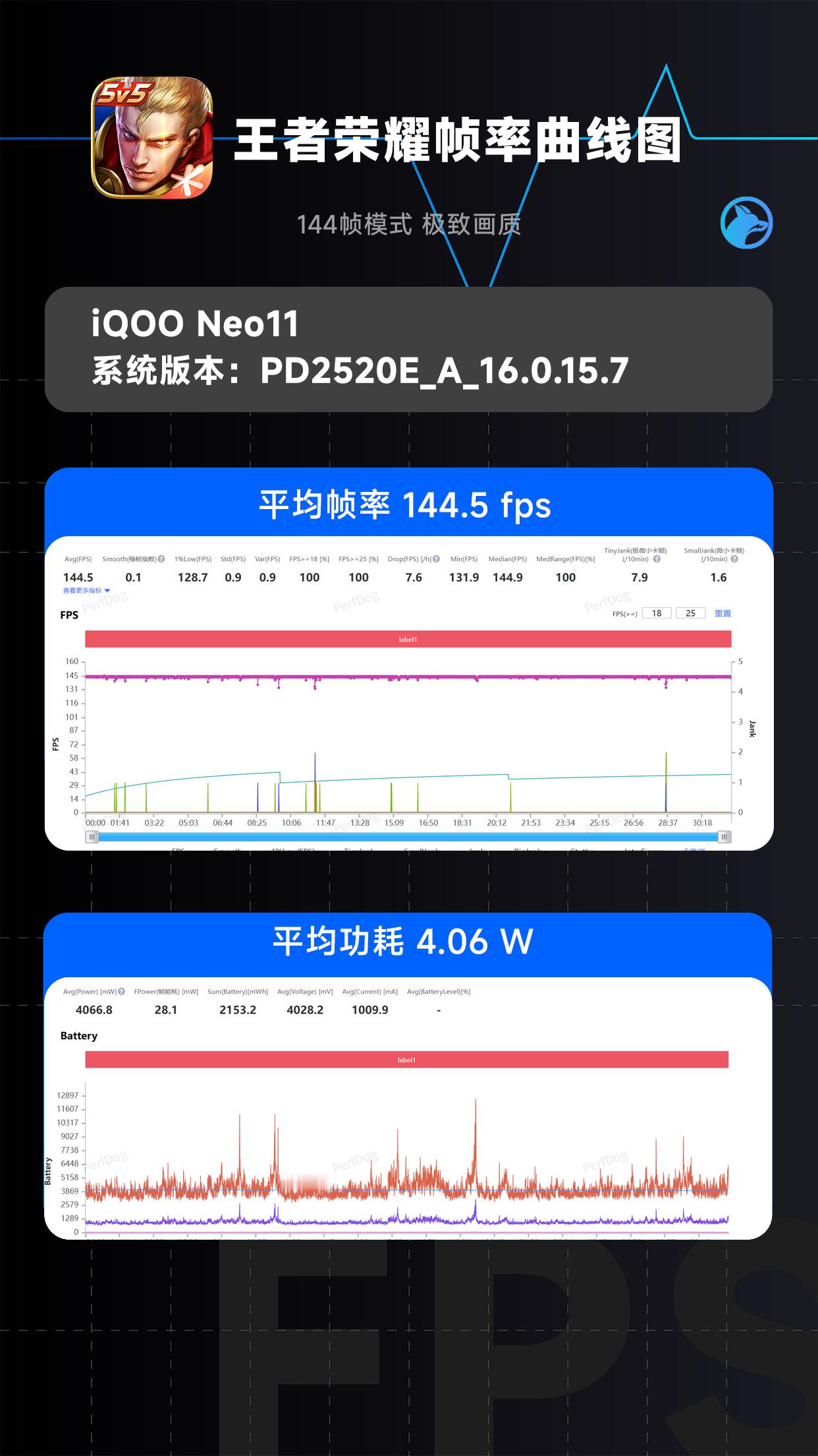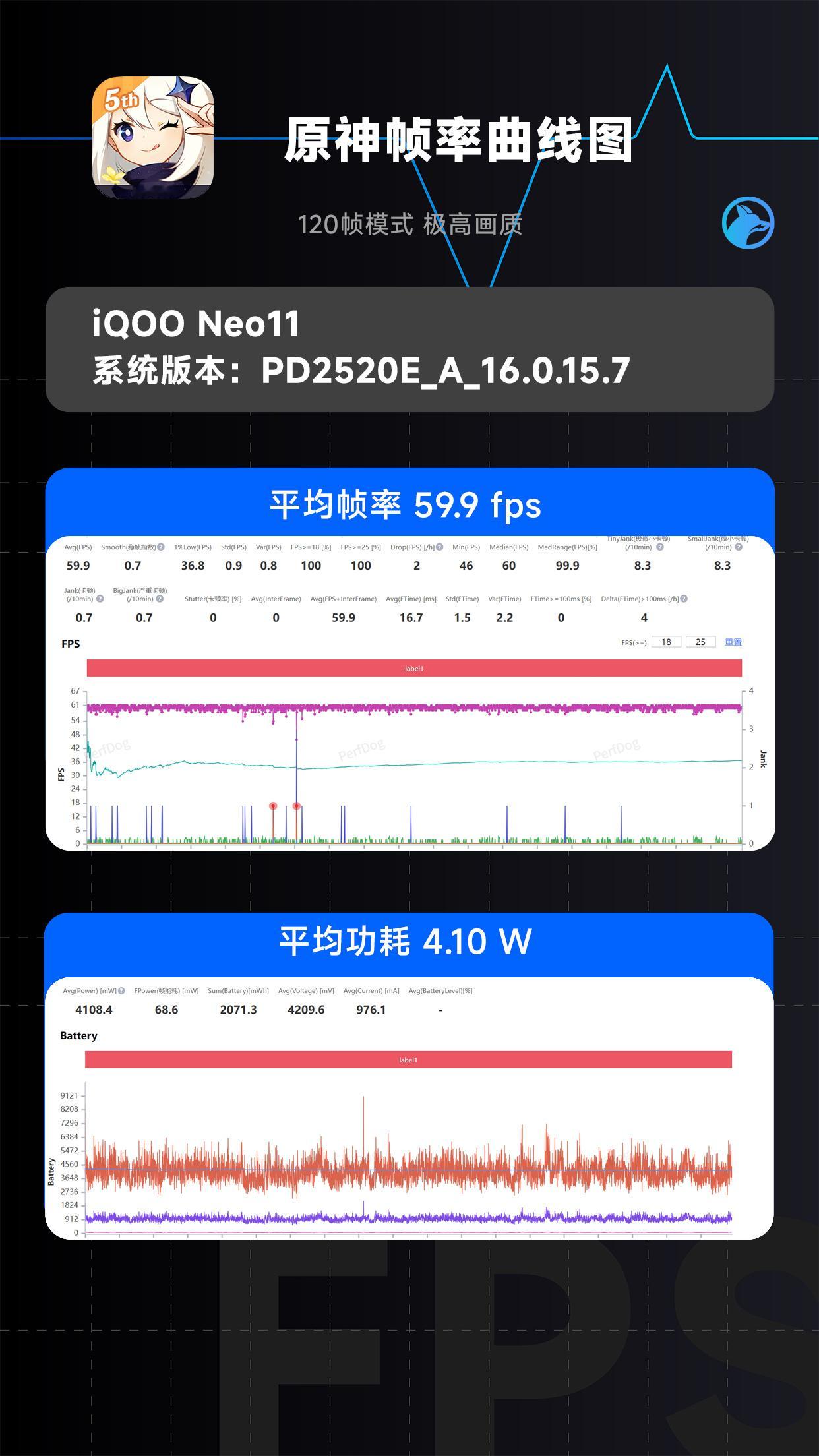标准版也能大满配,屏幕独树一帜●屏幕这块基于京东方Q10+发光材料打造的屏幕,是Neo11绝对的长板先看它的纸面参数:6.82英寸直屏,3168×1440的分辨率,144Hz的刷新率,全局激发亮度1800nits把这块屏幕放在Neo这个产品线上,说一句旗舰级的体验不过分吧,无论是游戏还是影音,都足够清晰流畅在护眼层面,采用了圆偏振光技术,显示更类自然光,默认是2592Hz的PWM调光,对频闪敏感的用户相当友好出厂即配AR膜,也是看齐了自己家的数字旗舰,增强抗反射能力,减少反光●性能作为一台性能向的手机,骁龙8至尊版加上自研Q2芯片这套组合拳,WiFi环境下,使用PerfDog作为数据采集软件,游戏实测表现如下5V5游戏极致画质和极致帧率,30分钟游戏平均帧率144.5帧,功耗4.06W,Neo11是首批支持极致帧率的产品之一,不需要游戏插帧,也能爽玩144帧模式开发世界30分钟须弥城跑图,平均帧率59.9帧,功耗4.1W,稳稳拿下想要更爽一点,超分插帧安排,在一些fps类游戏,可以实现2K+144帧的超分超帧并发●其他电池给到了一块7500mAh大电池,支持100W的有线充电,不用担心续航和补能掉链子,支持直驱供电,在游戏场景能减缓发热3D超声波指纹,IP68和IP69的防水防尘,铝合金中框,双频GPS,全功能NFC,标准版也能通通配齐●总结这一代的Neo,在外观小改的基础上,内核却是脱胎换骨,标配就是同价位的大满配,而且这块2K分辨率的屏幕,在今年的手机市场,实在是太稀有了