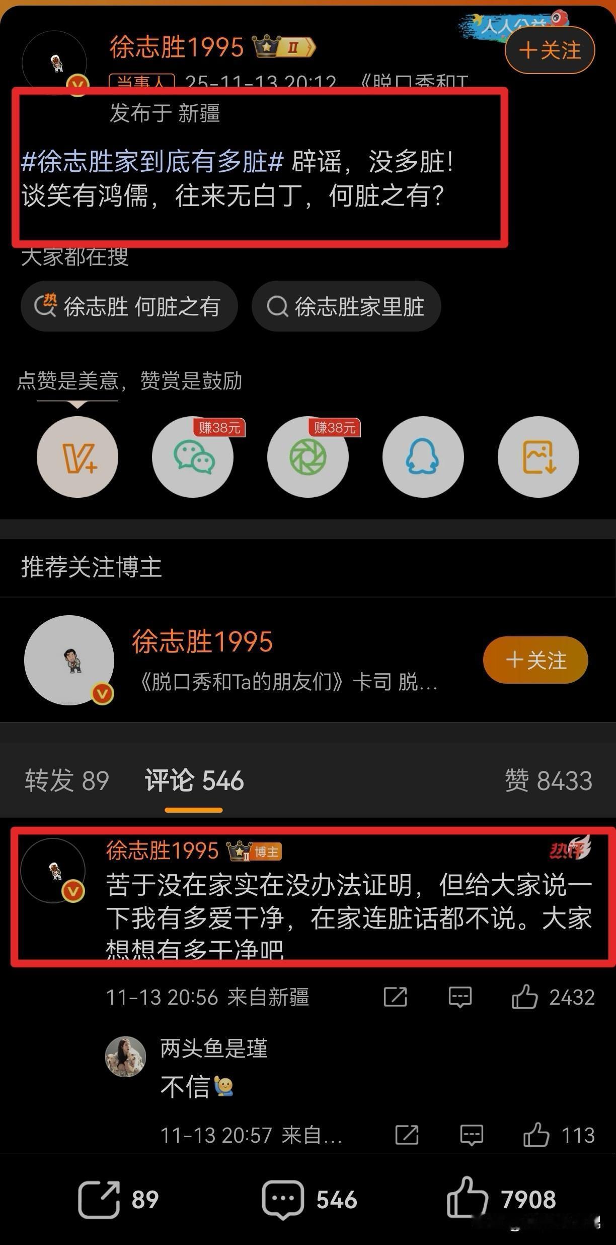李诞疯了吗?开直播吐槽徐志胜家里脏的想带消毒罐,吓得徐志胜连发两条辟谣! 李诞今天在直播中说自己能跟徐志胜做朋友,肯定不是洁癖!说徐志胜家里脏的“跟大学男生宿舍一样”,“太埋汰了”,“都不敢往沙发上坐”,“想带消毒罐”。 随后徐志胜连发两条微博高情商澄清,“没多脏,谈笑有鸿儒,往来无白丁,何脏之有?”。 直接把卫生层面的脏,转移到文化和言语层面,被粉丝夸“有文化的辟谣!” 李诞和徐志胜的关系挺好的,不至于公开徐志胜隐私,这会不会是给徐志胜的段子积累素材呢? 毕竟徐志胜曾经在段子里自嘲,“家中堆满干垃圾、湿垃圾、混合垃圾”。