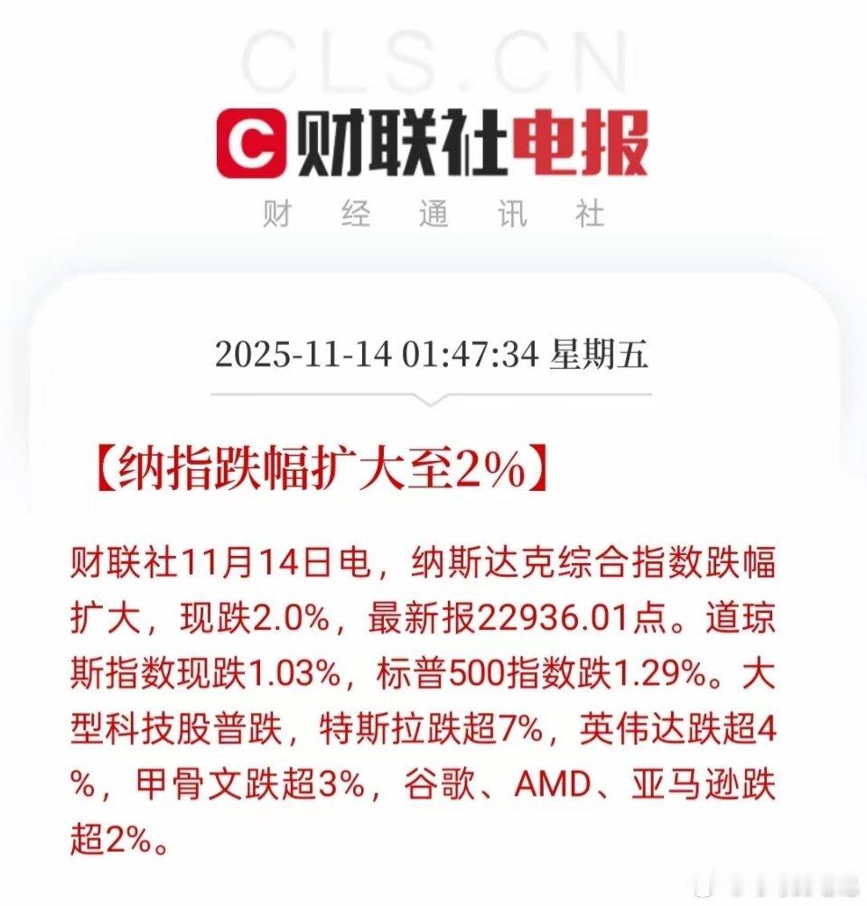 隔夜美股惊魂:AI龙头领跌,多板块承压,降息预期降温成“导火索”一觉醒来,隔夜美股的暴跌行情让人直呼“心惊”——以英伟达为代表的AI龙头集体遭遇做空冲击,市场整体表现低迷,多个关键板块与资产价格同步下探。具体来看,此次下跌态势相当显著:1. AI巨头英伟达单日跌幅达4%,作为板块风向标,其走势直接拖累市场情绪;2. 同为科技领域的博通跌幅更深,当日下跌5%,科技板块整体承压;3. 特斯拉股价波动更为剧烈,盘中最大跌幅一度触及7%,最终收跌6%,成为下跌阵营中的“重灾区”;4. 指数层面同样不容乐观,纳斯达克综合指数跌幅持续扩大,最终跌破2%关口;5. 标普500指数与道琼斯工业平均指数也未能幸免,双双下跌1.5%,美股三大指数集体走弱。更令人意外的是,这场下跌潮还蔓延至加密货币市场,比特币当日同步下跌2%;就连此前表现尚可的纳斯达克中国金龙指数,也从早盘的红盘状态翻绿,最终收跌1.6%,投资者资产账户普遍面临缩水压力。回顾此次市场动荡,“降息预期降温”被认为是关键推手——市场对美联储后续降息的时间与幅度预期减弱,流动性宽松预期收紧,这一变化对高估值科技股、成长股冲击尤为明显,最终引发了这场跨板块的集体下跌。