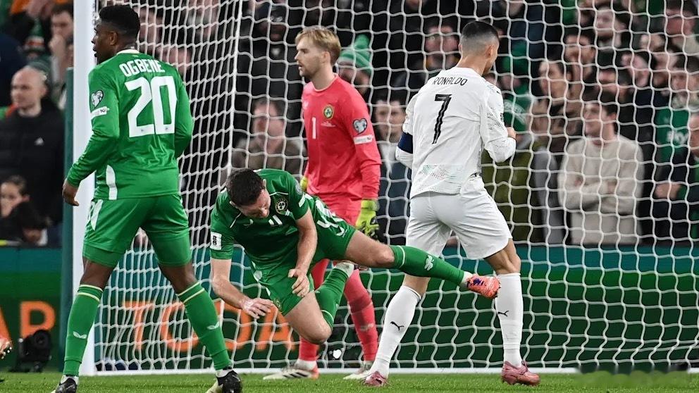 C罗领到226场国家队比赛的第一张红牌,大概率会被追加停赛。如果葡萄牙最后一场主场对阵亚美尼亚顺利出线,C罗将会缺席葡萄牙在世界杯正赛前面阶段的比赛。如果葡萄牙不得不踢附加赛,C罗也将很可能缺席……当C罗下场的时候,爱尔兰球迷高呼梅西